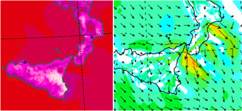In queste situazioni sovente l’avvento nei bassi strati di una ventilazione da SO, O-SO e Ovest tenderà a surriscaldare ulteriormente l’aria, soprattutto sulla Sicilia orientale, per l’effetto “favonico” esercitato dai venti di caduta dai rilievi interni dell’isola. Difatti, dopo aver attraversato tutto l’entroterra isolano, raccogliendo aria molto calda, la ventilazione sud-occidentale tenderà a ridiscendere sulla costa messinese, la piana di Catania, il siracusano e il ragusano, ulteriormente arroventata, a causa anche della “compressione adiabatica” indotta dalla componente discendente costretta a scendere dai rilievi interni isolani verso il mar Ionio.