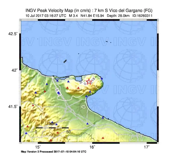 Un terremoto magnitudo ML 3.4 si è verificato 7 km a sud da Vico del Gargano (FG) alle 05:16:27 ad una profondità di 28 km.