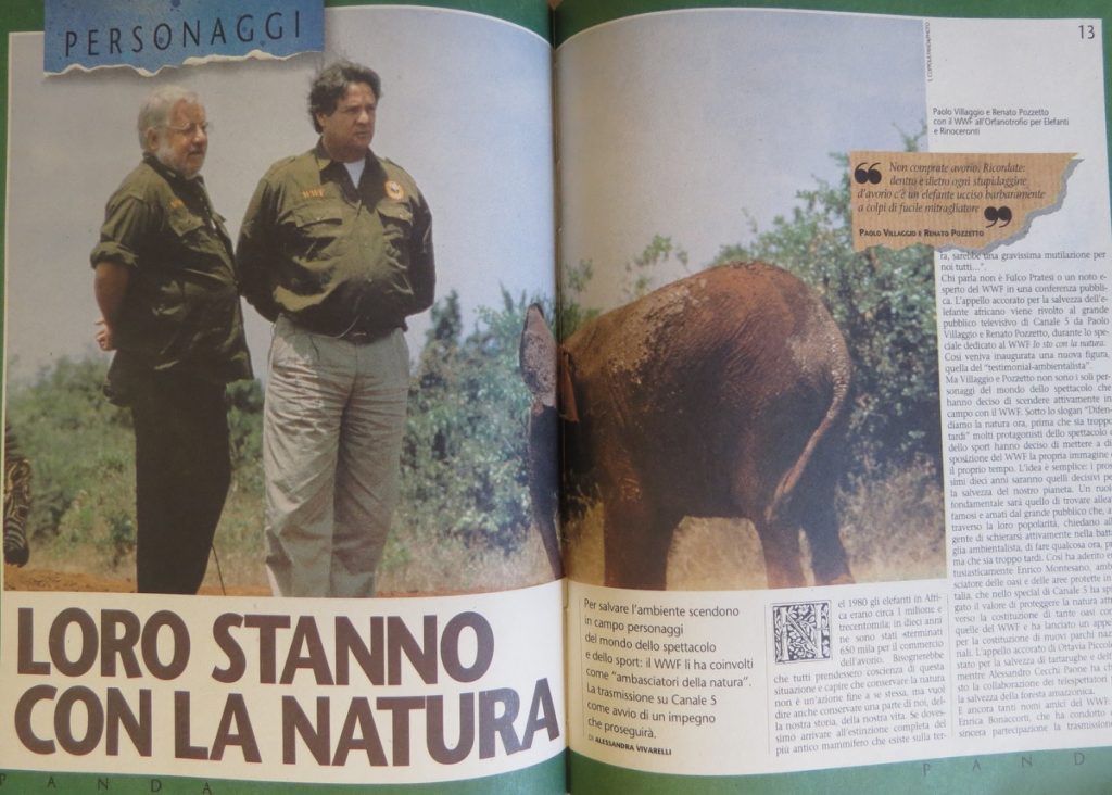 Il WWF ricorda con grande affetto Paolo Villaggio riportando alla luce un numero della rivista Panda dell’ottobre 1990 dove l’attore, insieme a Renato Pozzetto, compariva come testimonial della campagna WWF “Io sto con la natura” in Africa, in divisa da ranger tra elefanti e zebre. “Non comprate avorio, ricordate: dentro e dietro ogni stupidaggine d’avorio c’è un elefante ucciso barbaramente a colpi di fucile mitragliatore” fu l’appello di Villaggio e Pozzetto, che presero parte anche ad uno speciale televisivo dedicato al WWF dal titolo “Io sto con la Natura”. Quell’esperienza per Villaggio e Pozzetto non si limitarono solo ad un presenza televisiva: con il WWF andarono in Africa in visita ad un “orfanotrofio” dove piccoli elefanti e rinoceronti a cui i bracconieri avevano ucciso i genitori venivano accuditi con l’obiettivo di essere reintrodotti in natura.