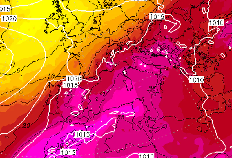 Questa notevole spinta meridiana del potente anticiclone sub-tropicale nord-africano, verso il bacino centrale del Mediterraneo, ha consentito una considerevole espansione (per “dilatazione”) della “Cella di Hadley”, stagnante sopra la vasta regione desertica del Sahara occidentale, verso l’Europa centro-occidentale, fra il sud della Francia, parte della Mitteleuropa e l’Italia. Una manovra ulteriormente favorita dalla risalita verso nord del “fronte di convergenza intertropicale” sull’Africa occidentale. La formazione di questo robusto anticiclone sub-tropicale, evoluto in un autentico anticiclone di blocco, con massimi di geopotenziali piuttosto elevati che si sono elongati fin sul Mediterraneo, ha praticamente arrestato il flusso del ramo principale del “getto polare”, in uscita dal nord America e dal vicino Atlantico, costringendolo a deviare verso latitudini più settentrionali, mentre il “getto sub-tropicale”, più a sud, sembra quasi dissipato fra Atlantico e Mediterraneo occidentale, almeno temporaneamente.