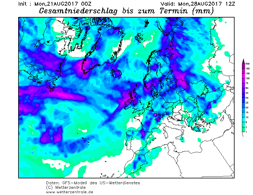 La mappa che calcola gli accumuli precipitativi, le piogge totali cioè, fino a tutto il 28 agosto 2017, offerta oggi da GFS, è inesorabile. Nulla, in termini precipitativi, attende il Sud e gran parte del Centro-Nord. Solo l’arco alpino vedrà dei fenomeni.
