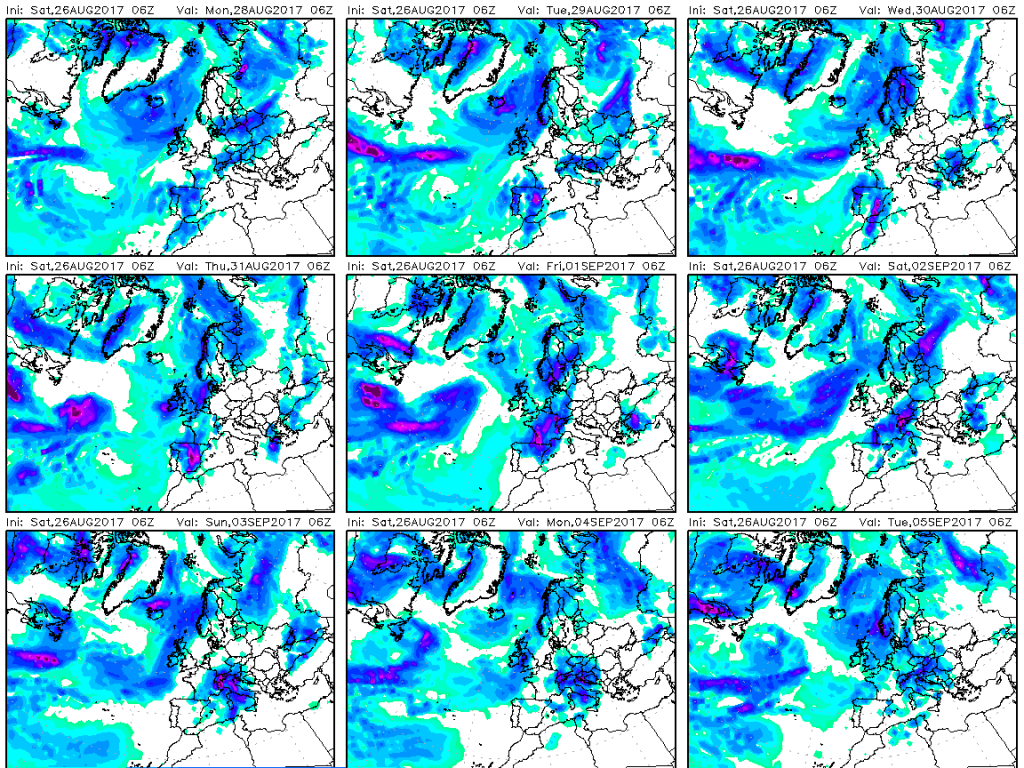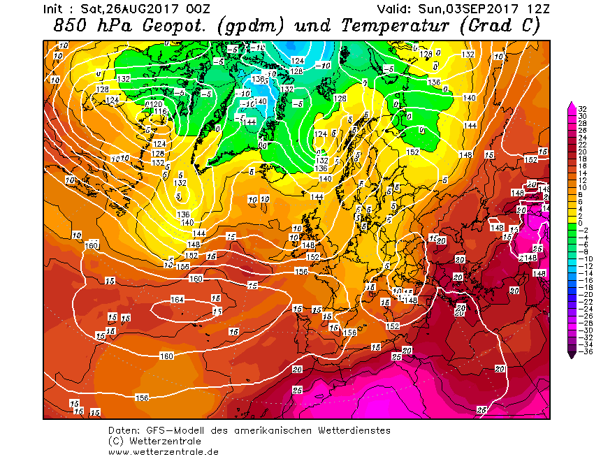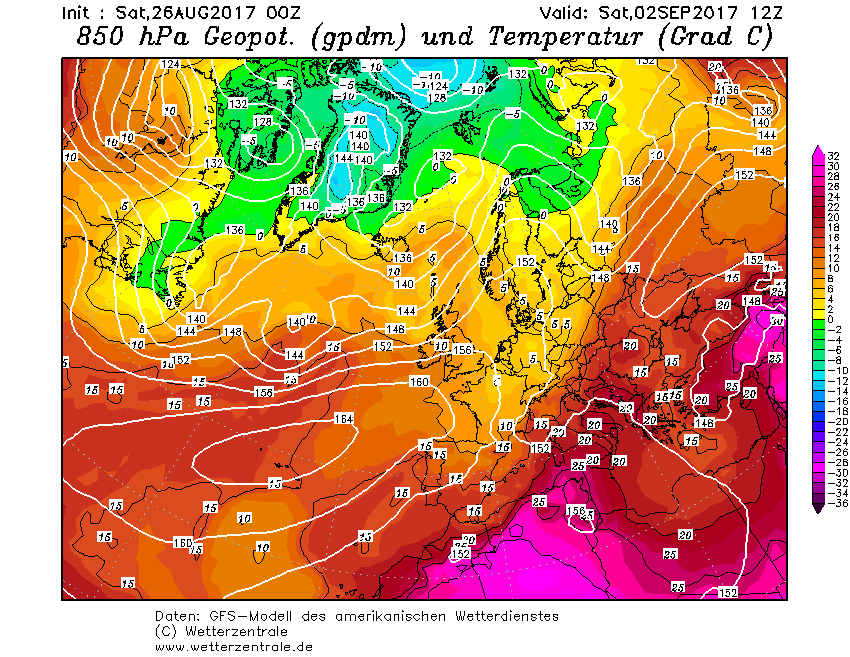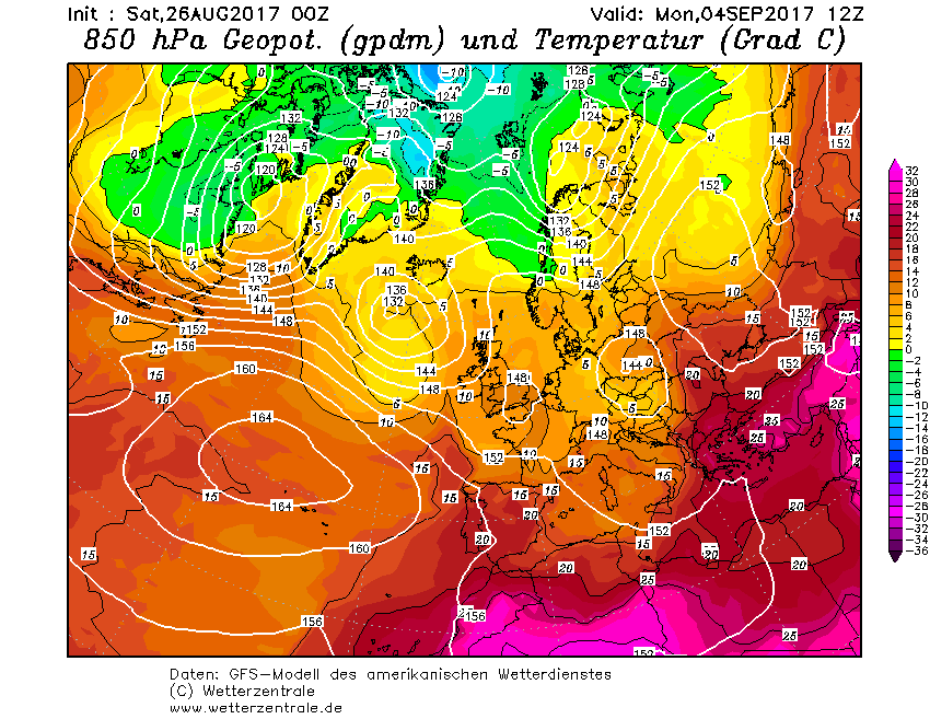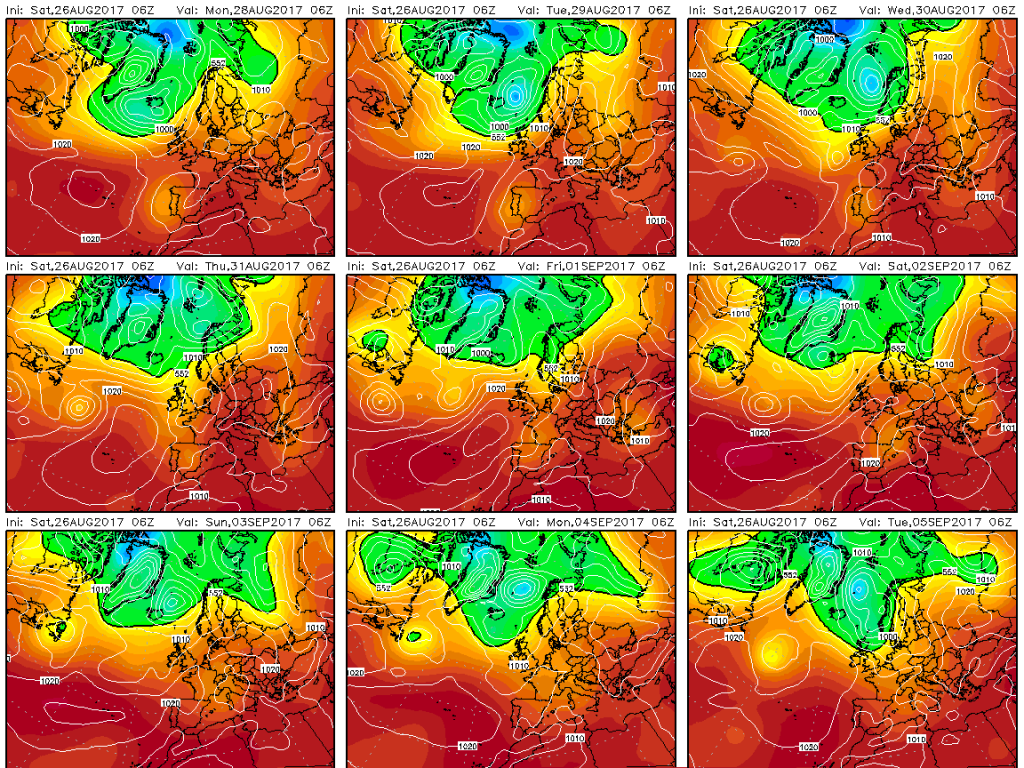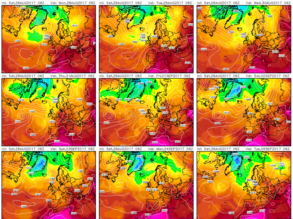 Secondo GFS, la vigorosa discesa di aria fresca che già da giorni è presente sulla costa atlantica, sposterà il suo asse verso est coinvolgendo così dapprima il Nord Italia e poi, a seguire fino al 4 settembre, tutto il Centro ed il Meridione.
