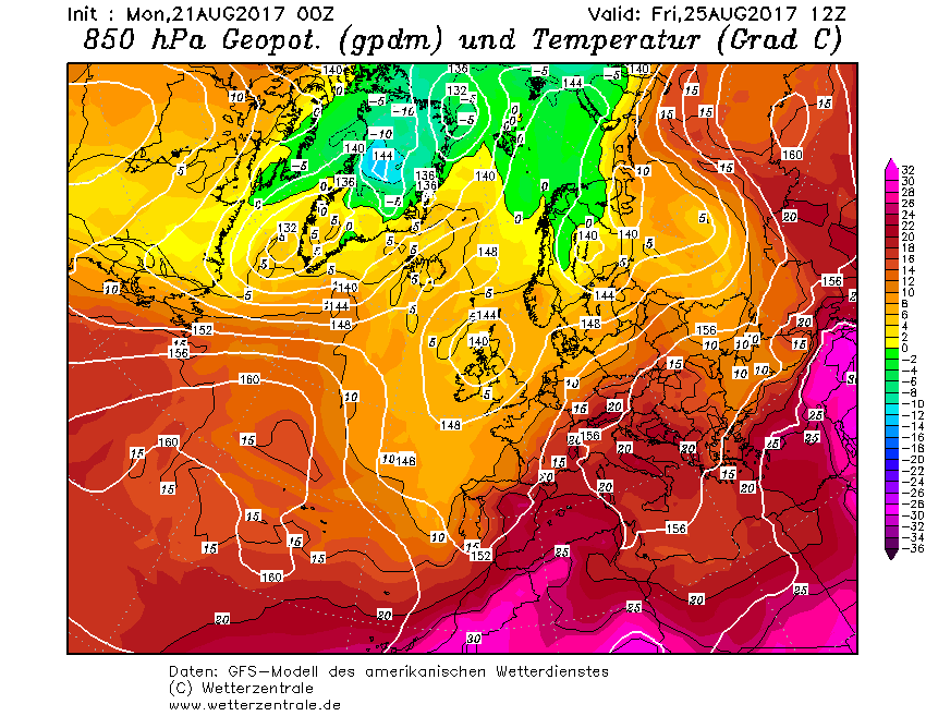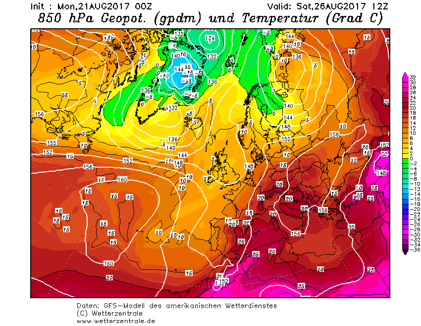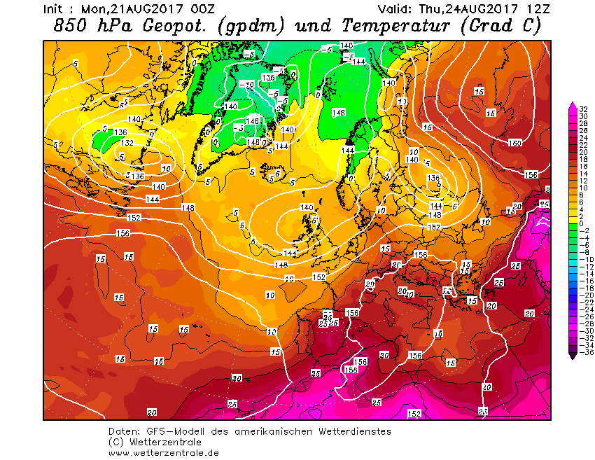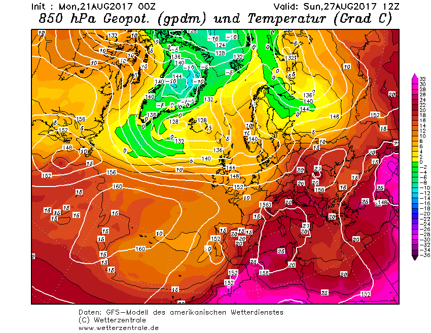 Aria fresca in quota, in discesa lungo tutta la costa atlantica, favorisce una rimonta ulteriore dell’Alta Pressione di matrice subtropicale, il che porterà sul Mediterraneo centrale nuovamente isoterme da +20° ai 1500 metri , già a partire dalla giornata di giovedì 24 agosto.