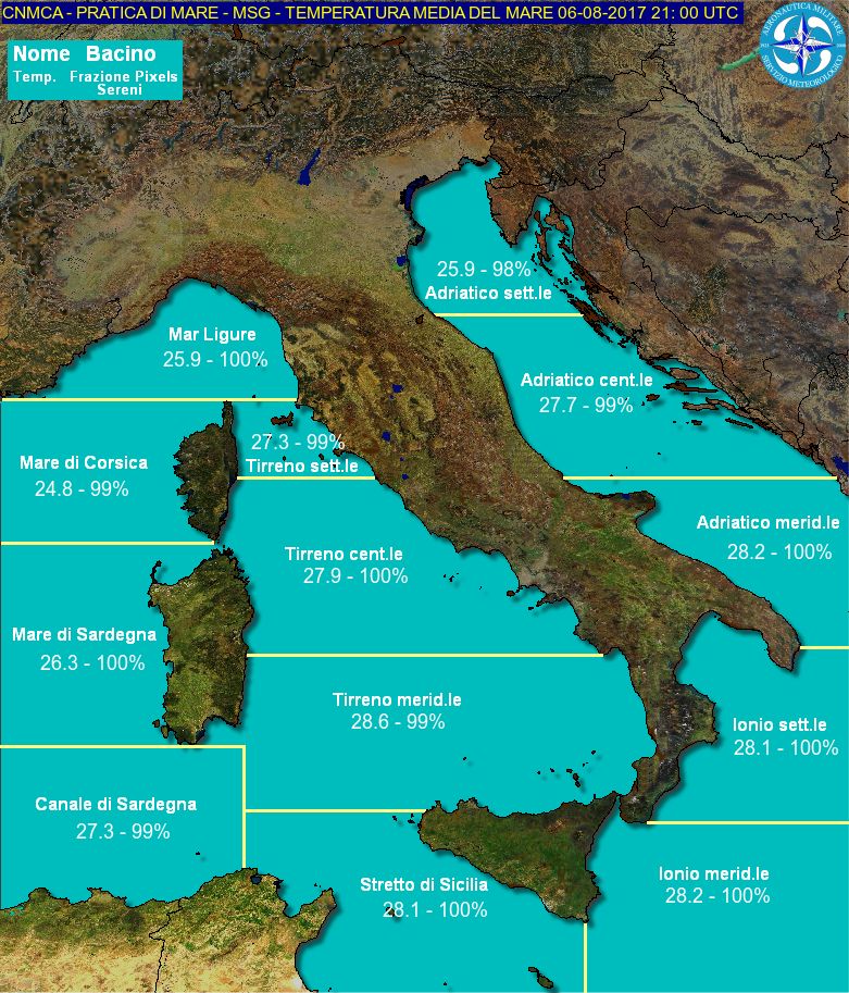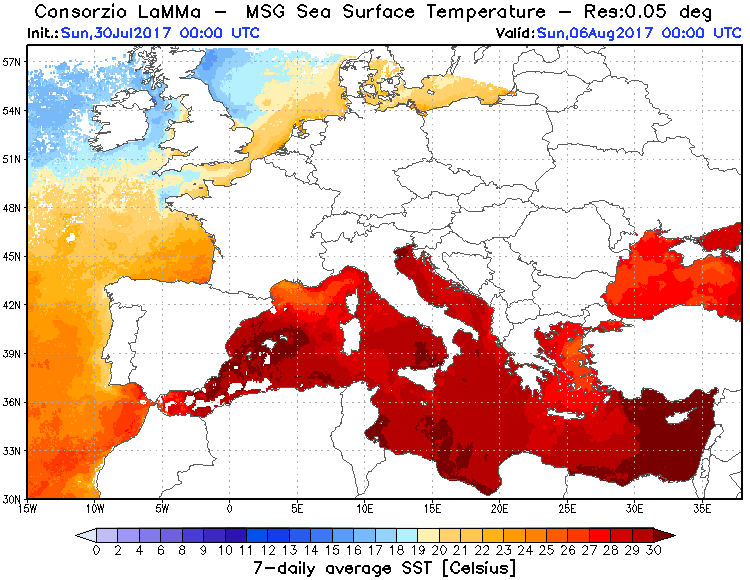 Una delle conseguenze inevitabile della persistenza dell’anticiclone africano sul bacino del Mediterraneo riguarda il sensibile, quanto anomalo, riscaldamento delle acque superficiali dei mari che circondano l’Italia. In alcuni punti, come su certi tratti dell’Adriatico e del basso Tirreno, si sono raggiunti valori ben superiori ai +28,5°C +29,0°C. Valori degni dei mari tropicali. E’ vero che durante l’estate, grazie al costante soleggiamento e alla stabilità atmosferica, le temperature dei mari tendono ad aumentare, spingendosi su valori spesso superiori alla soglia dei +24°C +25°C, seppur con una certa gradualità. Oggi pero su molti bacini, dal Tirreno all’Adriatico, vengono misurati valori che in qualche caso si spingono ben oltre i +3,5°C +4,0°C rispetto le tipiche medie del periodo.