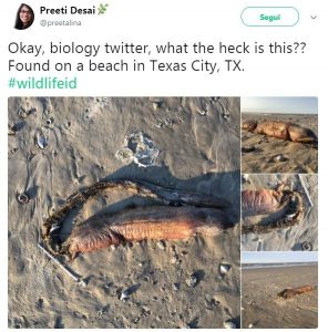 Una misteriosa creatura è stata fotografata su una spiaggia del Texas da Preeti Desai, fotografa naturalista. La carcassa dello strano animale è stata trovata dopo il passaggio dell’uragano Harvey. La donna ha postato su Twitter le immagini e ha chiesto agli utenti, in particolare ai biologi, se sapessero cosa fosse. Secondo alcuni esperti potrebbe appartenere alla specie Ophichthidae, una famiglia di pesci anguilliformi o alla Aplatophis chauliodus, ovvero una anguilla che vive a grandi profondità nell’Atlantico.