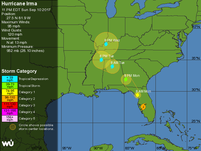 Con venti a 215 km all’ora, l’uragano si è abbattuto ieri mattina sull’arcipelago delle Keys (era classificato di 4ª categoria) ed ha fatto danni considerevoli. Poi ha toccato di nuovo terra sulla costa della Florida nel pomeriggio di ieri, a Marco Island, sulla costa ovest, con venti a 185 km all’ora, mentre era di 3ª categoria. Infine è stato retrocesso alla 2ª categoria. Nel suo passaggio sui Caraibi e sulla Florida Irma ha causato 30 morti, tre nello stato Usa.