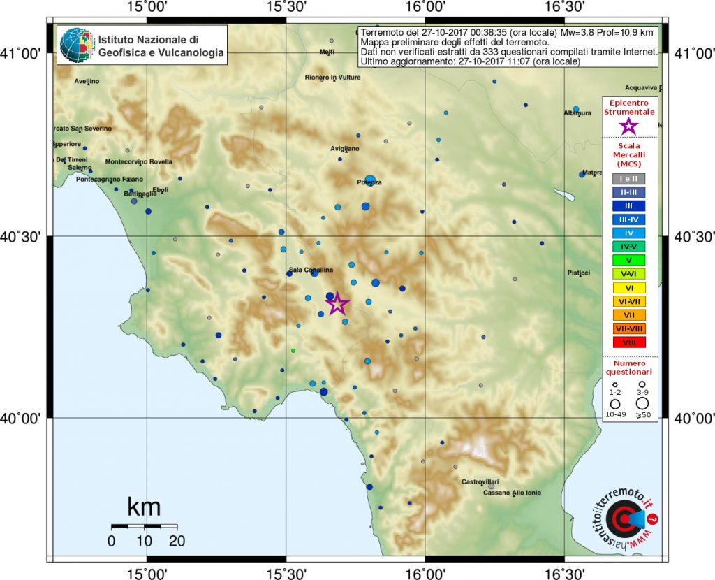 Paura in varie zone d’Italia per la terra che trema a causa delle scosse di terremoto delle ultime ore. La più forte ha colpito alle 00:38 della notte il cuore del Sud Italia, nella Campania meridionale, di magnitudo 3.8 e con un risentimento sismico fino al 5° grado Mercalli nel Cilento. Stamattina a seguito della scossa nel Vallo di Diano, a sud di Salerno, in via precauzionale stamattina resteranno chiuse le scuole di ogni ordine e grado in diversi comuni. I sindaci hanno anche emanato delle ordinanze finalizzate a specifiche verifiche sismiche. In tanti si sono riversati per le strade: A Sala Consilina gli abitanti dei piani alti dei palazzi hanno abbandonato in pigiama le proprie abitazioni. Secondo i rilevamenti dell’Istituto nazionale di geofisica e vulcanologia (Ingv), il sisma ha avuto ipocentro a 11 km di profondita’ nella zona di Padula. Non si segnalano danni a persone o cose. La scossa e’ stata avvertita anche nel Golfo di Policastro, nel basso Cilento, nel Tanagro ed in alcuni centri del Potentino confinanti con il Vallo di Diano.