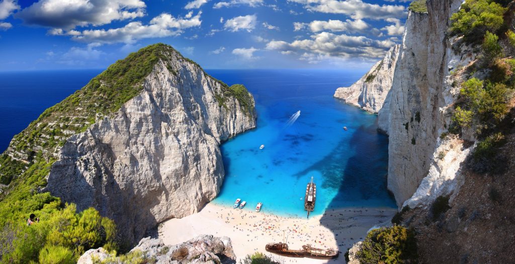Zante con un’area di 405 km quadri, è un’isola del mar Jonio situata a 300 km ad ovest di Atene e vanta alcune delle più belle spiagge della Grecia. Si tratta di un vero e proprio paradiso terrestre con sabbia finissima lambita da un mare turchese con fondali cristallini. Nota ai più come isola natale di Ugo Foscolo, Zacinto o Zante è proprio come la dipinse il poeta nella sua lirica e le Grotte blu sono una delle sue attrazioni più famose e pubblicizzate, che possono essere visitate sia con un’imbarcazione propria che tramite uno dei tanti tour in barca organizzati.