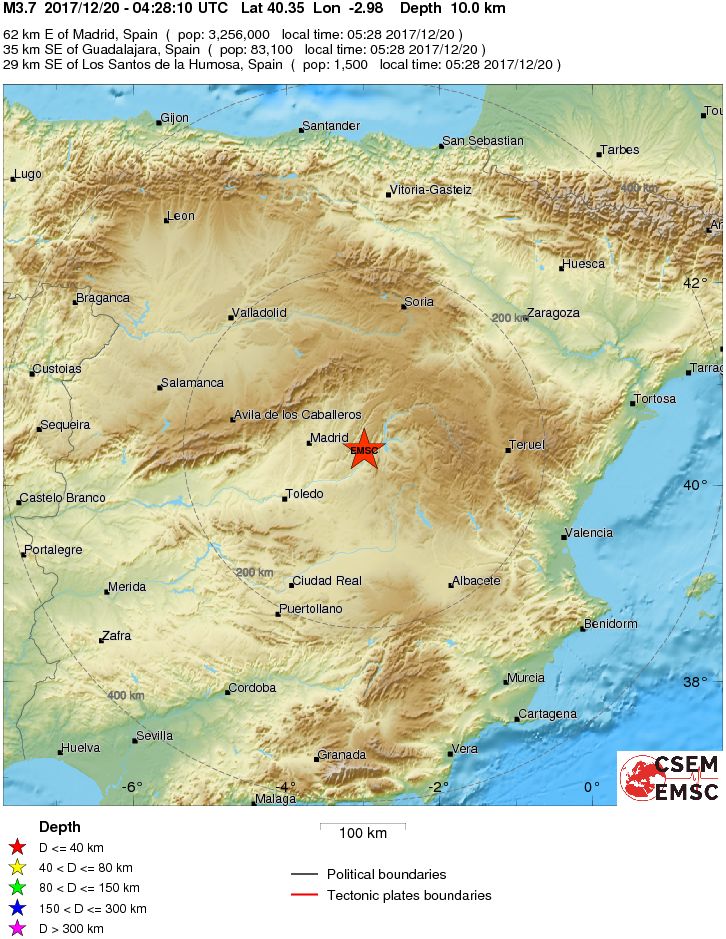 Stamattina alle 05:28 una scossa di terremoto di magnitudo 3.7 ha colpito l’hinterland orientale di Madrid, con epicentro a Yebra (Guadalajara). La scossa è stata distintamente avvertita anche nella Capitale spagnola: l’epicentro, infatti, s’è verificato ad appena 60km dal centro cittadino madrileno. L’ipocentro della scossa è stato misurato a 11km di profondità, secondo l’Istituto Nazionale Geografico iberico. Nella città storica di Guadalajara s’è segnalato anche qualche danno agli edifici più antichi, con crepe e lievi crolli.