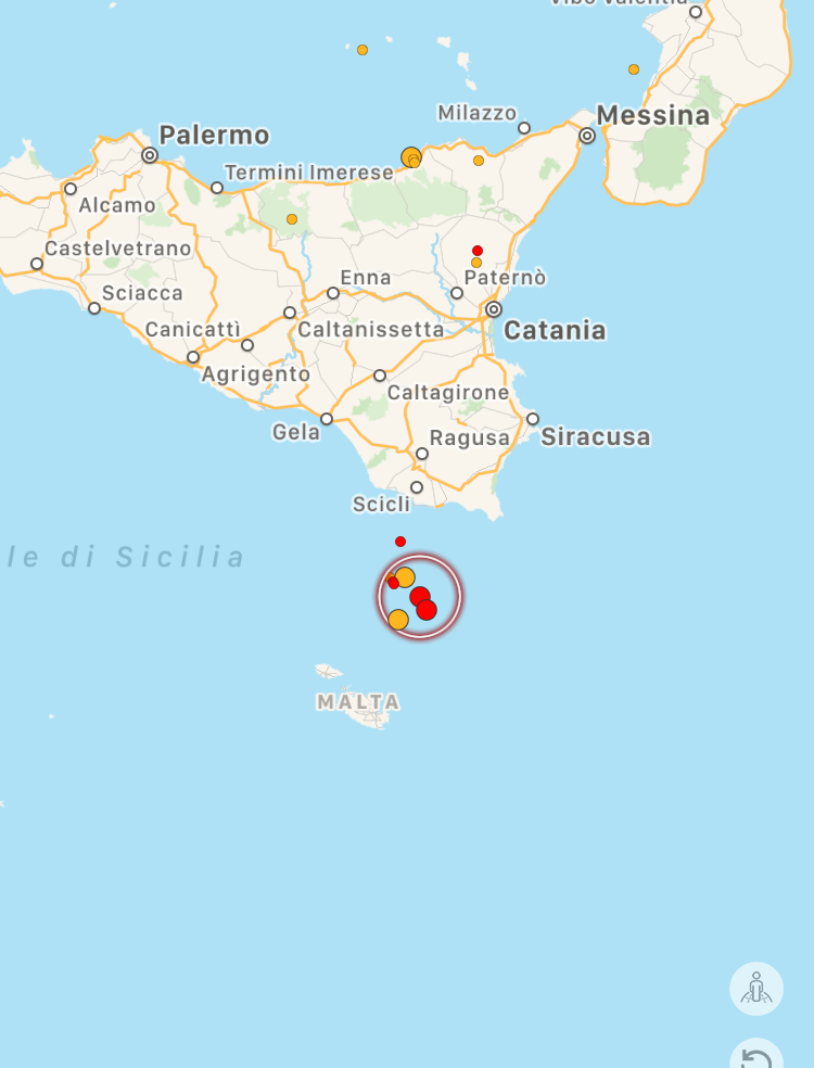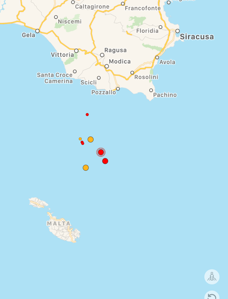 Boom di scosse di terremoto nelle ultime ore nel Mediterraneo: paura all’estremo Sud dell’Italia per due sciami che si sono attivati nel Canale di Sicilia e nel mar Jonio. Il più attivo è quello tra la Sicilia e Malta, con 14 scosse nell’ultima settimana di cui 4 con magnitudo superiore a 3.5 nelle ultime ore, tra ieri e oggi. Nella notte le due scosse più forti: magnitudo 3.7 alle 03:59 e magnitudo 3.9 alle 03:13. Intanto sempre nella notte un altro sciame ha interessato il mar Jonio al largo della Grecia, con tre scosse: la più forte di magnitudo 4.3 alle 03:08, pochi minuti prima della scossa più forte avvertita tra Malta e la Sicilia (dove molte persone si sono svegliate nel cuore della notte, in Sicilia a Ragusa, Modica, Noto, Vittoria, Scicli, Rosolini, Ispica, Avola e Comiso). Altre scosse minori (entrambe di magnitudo 3.1) hanno colpito nelle ultime ore il Marocco, a pochi chilometri da Gibilterra, e la Croazia con epicentro vicino Split.