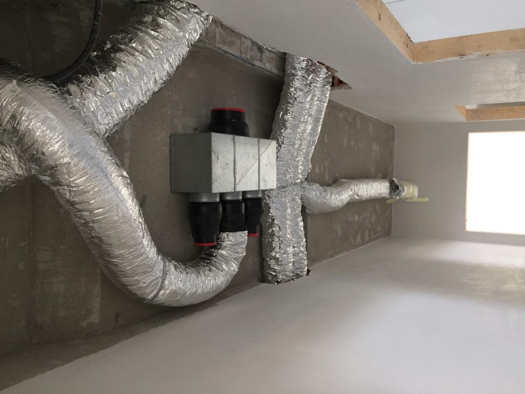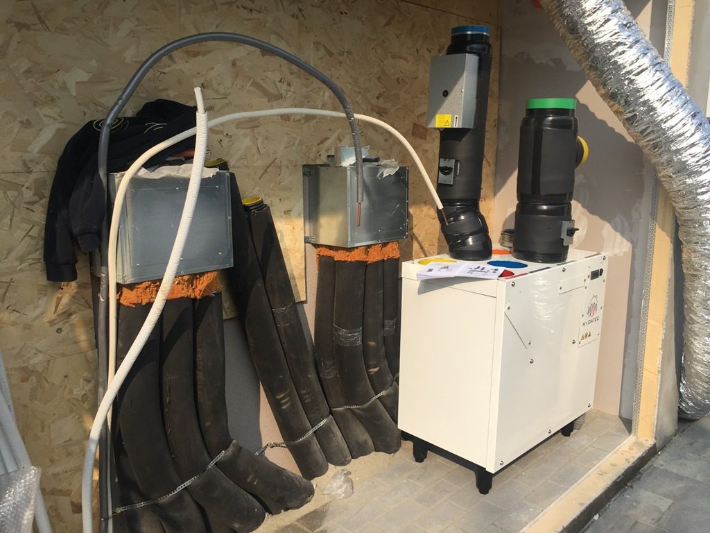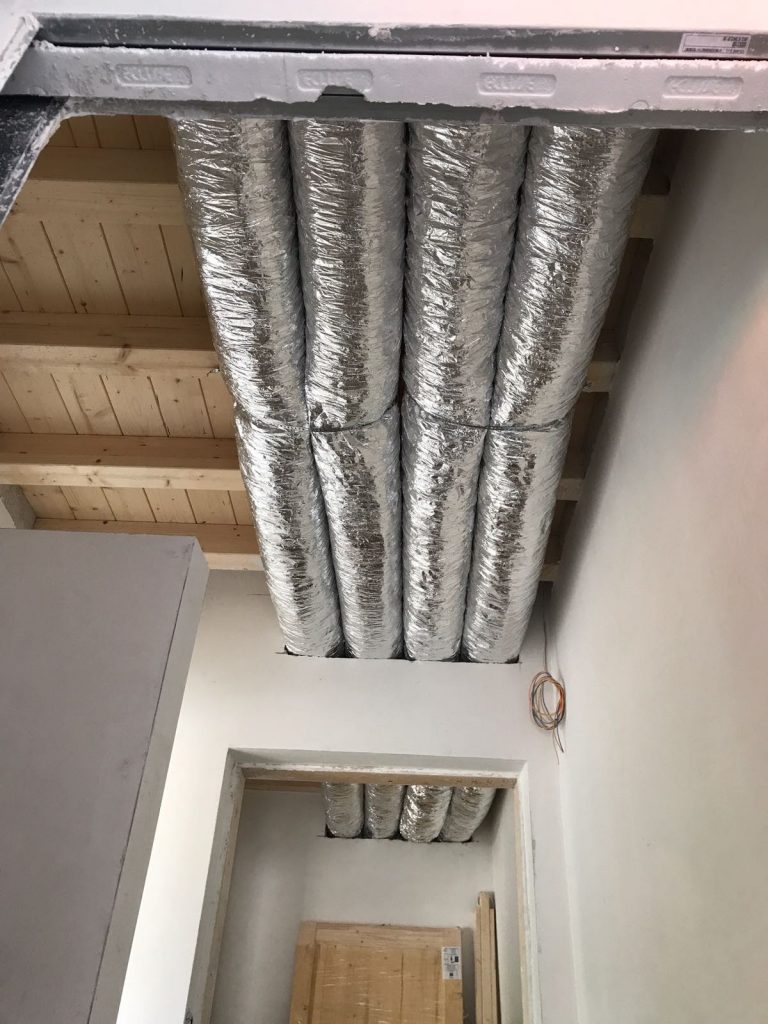 Successivamente, sono state inserite le bocchette di ventilazione nelle pareti prefabbricate e poi le tubazioni a pavimento e a soffitto. Ad abitazione quasi ultimata, ci siamo occupati dell’installazione delle macchine MyDATEC, la cui installazione completa ha richiesto circa una settimana.