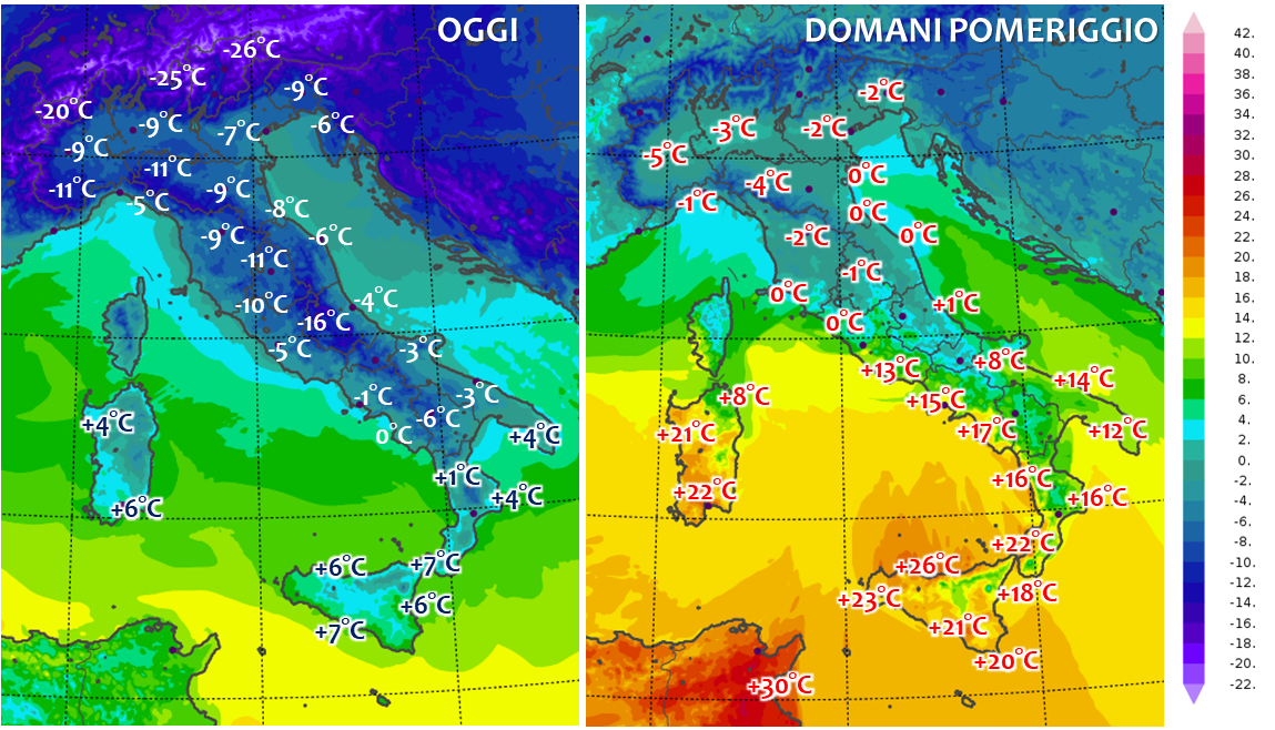 Le temperature aumenteranno sensibilmente in tutto il Paese rispetto ai valori glaciali degli ultimi giorni. La Regione più calda sarà la Sicilia, con Palermo che nel pomeriggio di domani volerà a +26°C. Caldo anche a Trapani, Agrigento, Ragusa e su tutta la fascia tirrenica, clima completamente differente invece tra Catania e Messina con piogge, scirocco e temperature che faranno fatica a superare i +17/+18°C. Stesso scenario sulla Calabria Jonica e in Puglia, dove comunque passeremo dalla neve di oggi ai +14°C di Bari. Nella Calabria tirrenica, invece, avremo picchi di +22°C sulla piana di Gioia Tauro e di +20°C a Lamezia Terme. Forte aumento termico anche in Campania dove ci aspettiamo +15°C a Napoli e +17°C a Salerno. Ma la seconda Regione più calda dopo la Sicilia, sarà la Sardegna con picchi di oltre +20°C diffusi su tutto il territorio, addirittura nelle zone interne e nel nord della Regione (Sassari potrebbe arrivare a +21°C). Anche nel Lazio meridionale, da Roma in giù, le temperature aumenteranno sensibilmente fino a +13°C. Al Centro/Nord, invece, anche domani farà freddo con temperature sempre sottozero in pianura Padana, Liguria, Toscana, Umbria, Marche, nord del Lazio e gran parte dell’Abruzzo per la persistenza del cuscinetto freddo ai bassi strati.