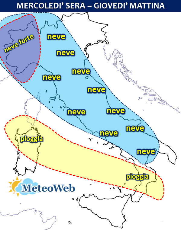 Proprio questa situazione con il forte scirocco caldo umido che arriva impetuoso dopo tre giorni di Burian glaciale, innescherà un pericolosissimo mix di maltempo. Già da stasera, infatti, il nuovo peggioramento porterà precipitazioni su quasi tutt’Italia. Avremo già dal pomeriggio delle piogge in Sardegna e Calabria, mentre inizierà a nevicare in modo anche intenso sul Nord/Ovest, in Piemonte e Liguria. Ma dopo le 21:30/22:00 le precipitazioni si estenderanno verso ovest a gran parte d’Italia, praticamente a tutto il Paese escluse le isole, la Calabria, il Salento e il Nord/Est. E durante la notte le precipitazioni saranno nevose praticamente ovunque, eccezion fatta per la Campania meridionale costiera. La neve tornerà anche a Roma, forse a Napoli, certamente fin sulle coste dell’Adriatico e sarà copiosa al Nord/Ovest, in Piemonte e Liguria.