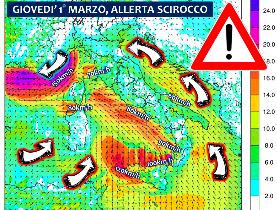 Sono tutte temperature che aumenteranno ulteriormente nel pomeriggio di oggi, con il Burian che mollerà la presa definitivamente tra stasera e domani, con lo scirocco che diventerà impetuoso soffiando per tutto Giovedì 1 Marzo con raffiche fino a 100km/h tra Sicilia tirrenica e Stretto di Messina, fino a 120km/h nella Sicilia occidentale, fino a 90km/h nella Calabria tirrenica, fino a 80km/h nel Tirreno centrale, fino a 70km/h in Toscana e fino a 60km/h in Puglia. In Liguria, invece, le temperature saranno mantenute basse da una tramontana scura che si incanalerà dalla pianura Padana e al largo del Golfo ligure supererà i 150km/h.