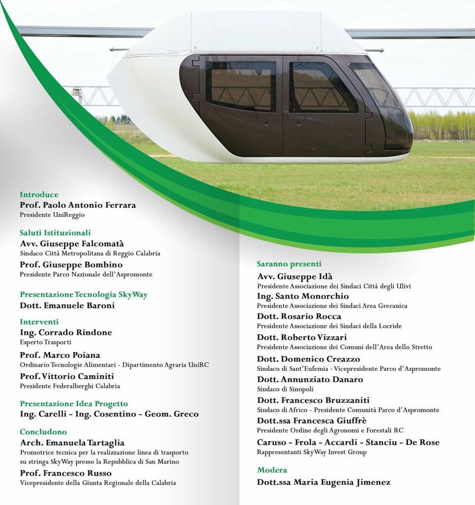 L’idea progetto Metro Aspromonte sarà illustrata dai tecnici Ing. Nicola Carelli, Ing. Vincenzo Cosentino, Geom. Francesco Greco incaricati da UniReggio a sviluppare l’idea progetto mentre la tecnologia SkyWay sarà affidata all’esperto dott. Emanuele Baroni.