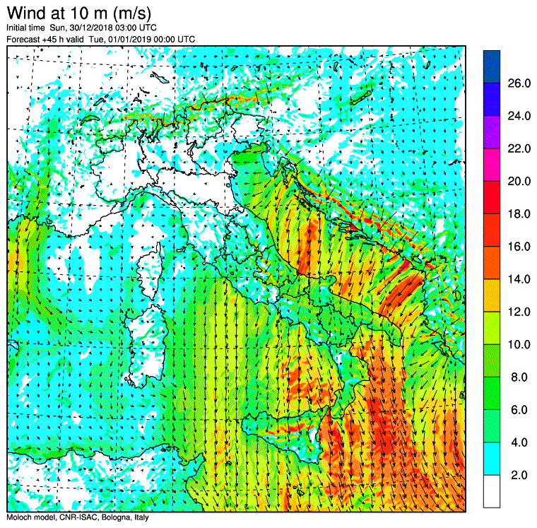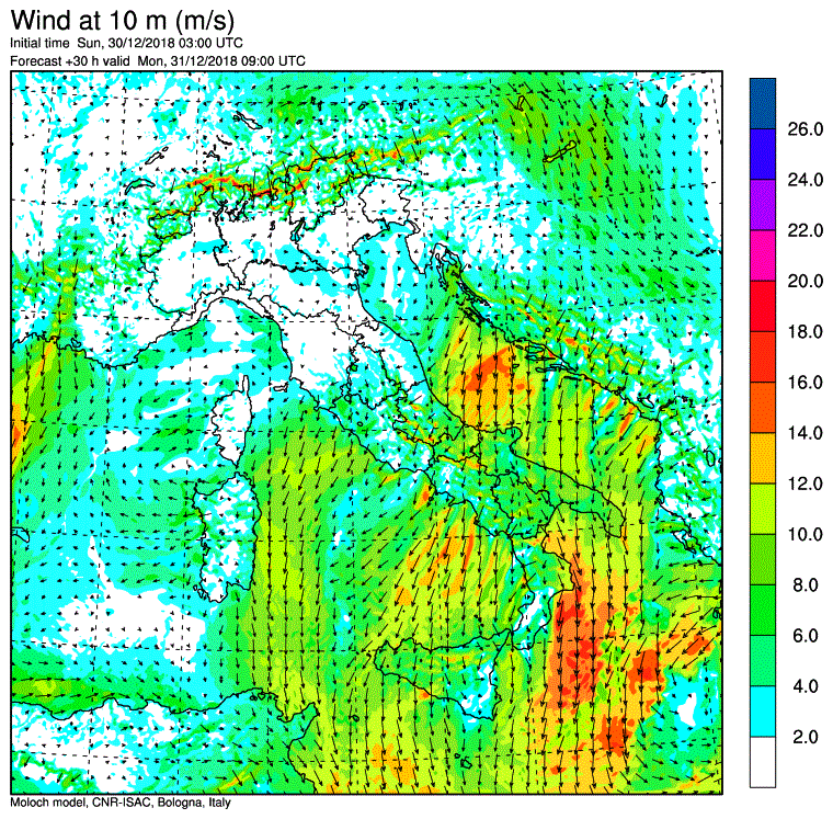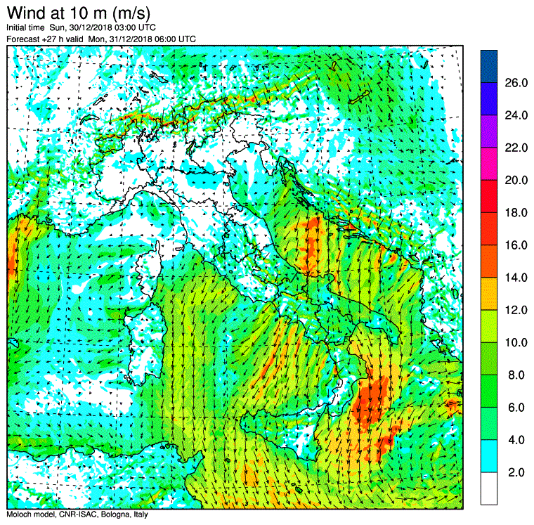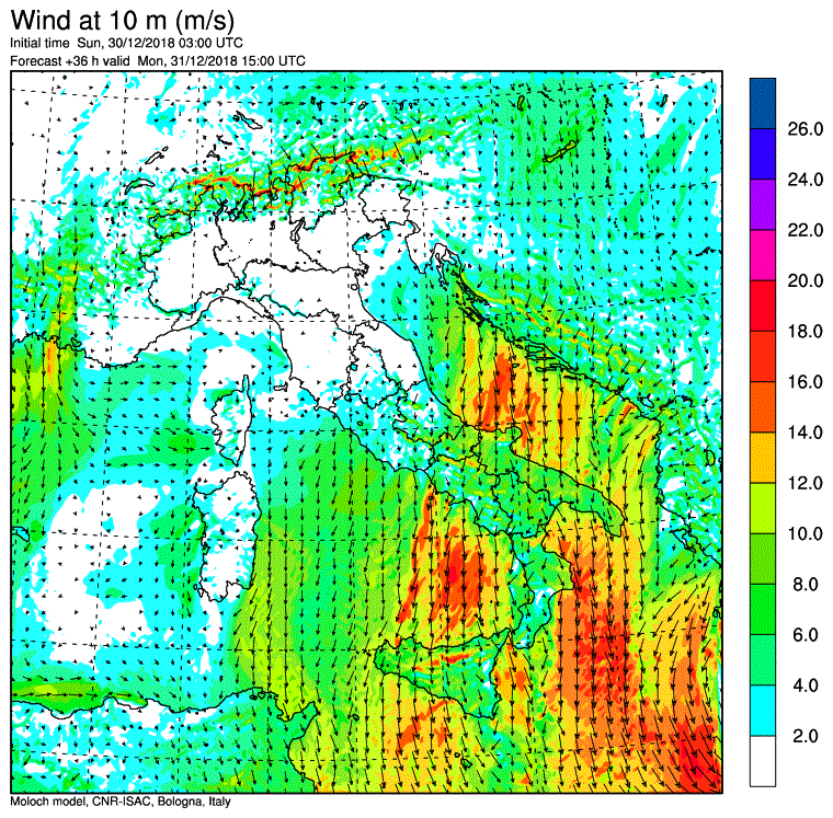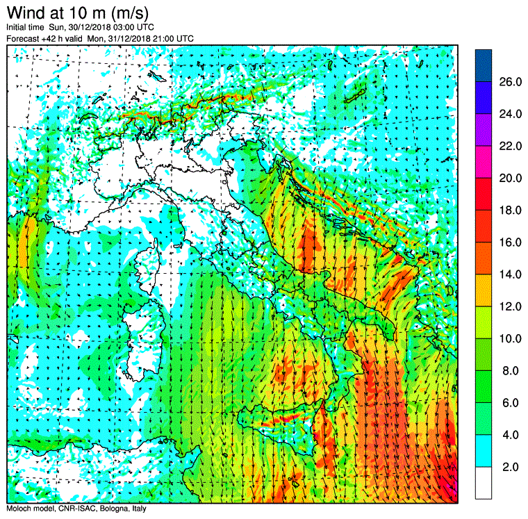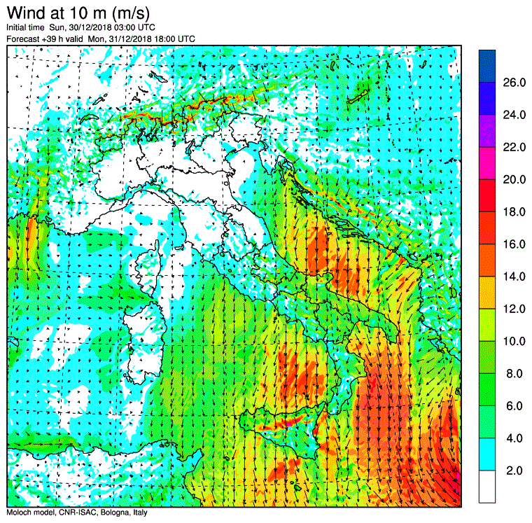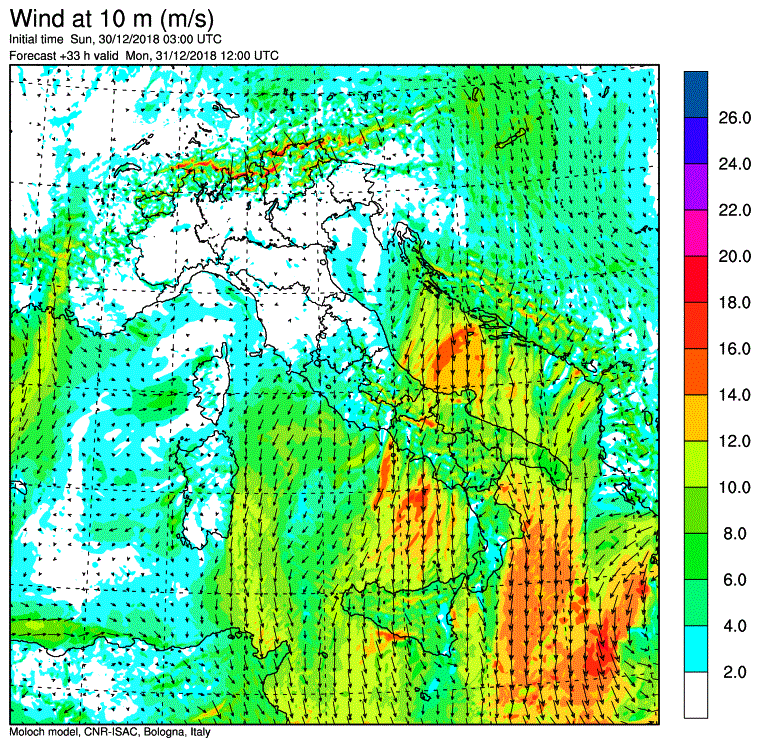 Scenario molto diverso al Centro/Sud dove nel pomeriggio/sera inizierà il brusco peggioramento accompagnato da aria fredda proveniente dai Balcani. Le temperature crolleranno sensibilmente portando la neve fino a bassa quota. Piogge e temporali interesseranno già in serata Abruzzo, Molise, Puglia, Basilicata, Calabria e Sicilia. Domani, Lunedì 31 Dicembre 2018, sarà una giornata tipicamente invernale con freddo pungente e forte maltempo proprio tra Abruzzo, Molise, Puglia, zone interne della Campania, Calabria e Sicilia. Altrove, al Nord, nelle Regioni centrali tirreniche e in Sardegna, continuerà a splendere il sole senza significative variazioni termiche: quest’ondata di freddo sarà limitata al medio/basso Adriatico e al Sud.