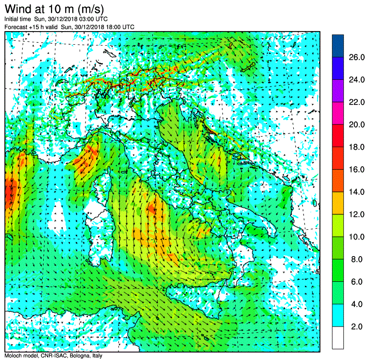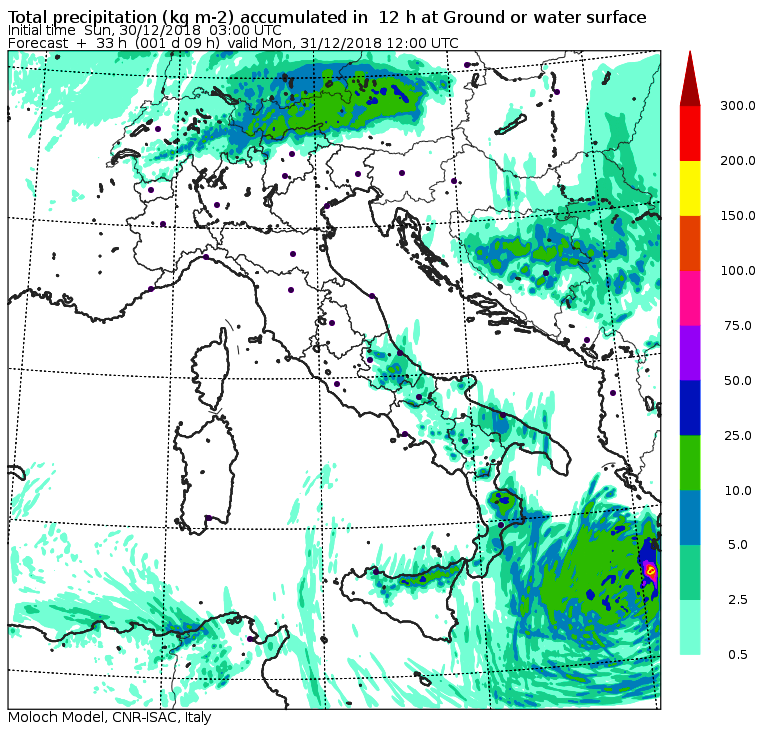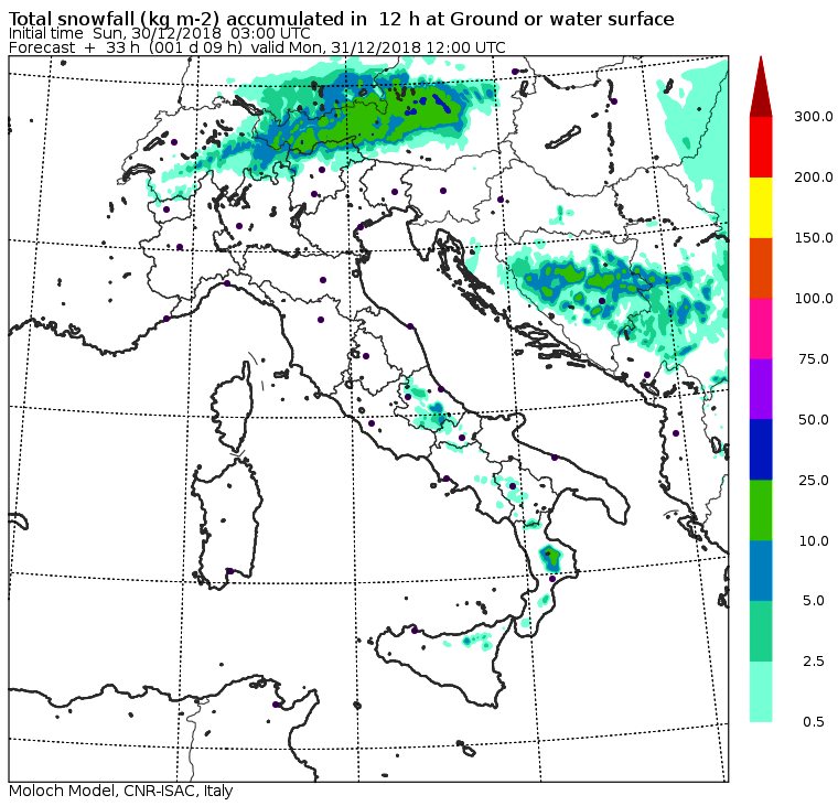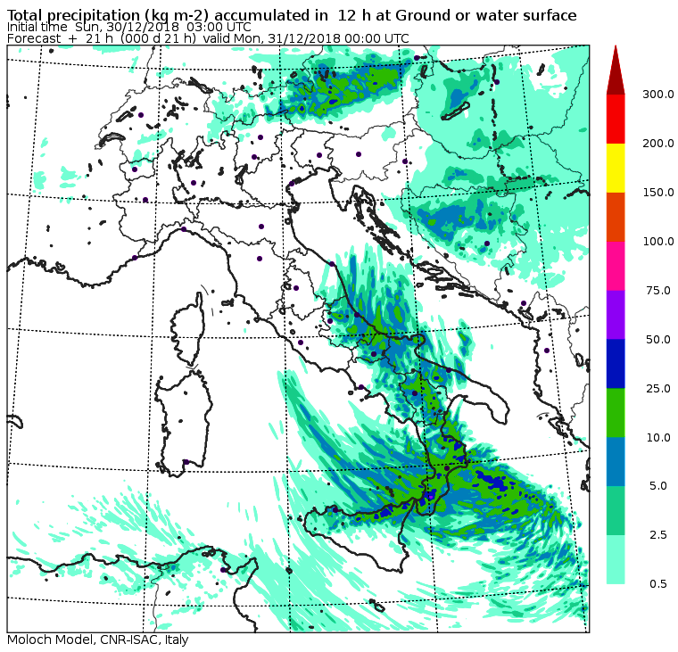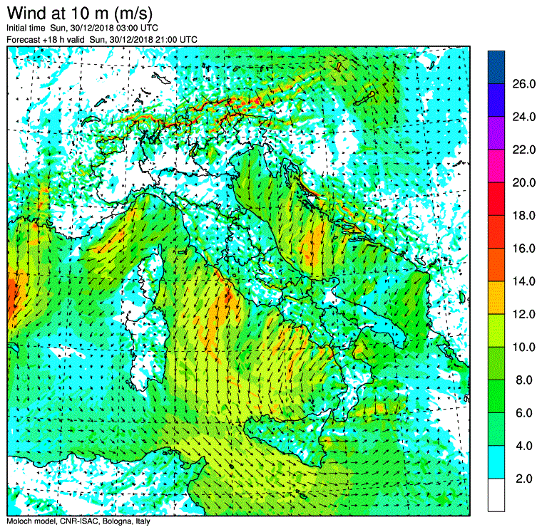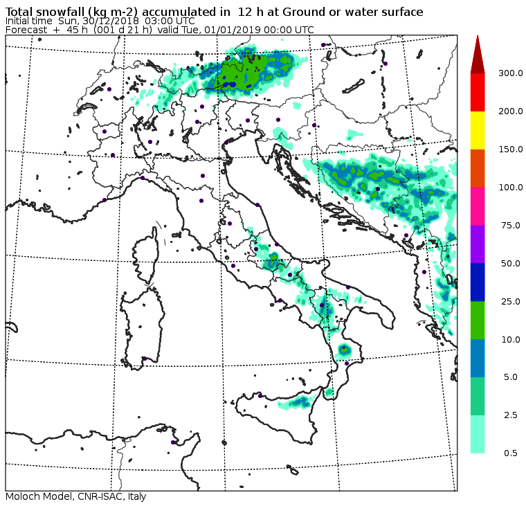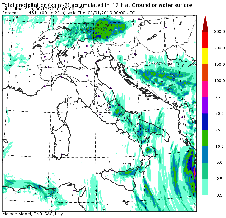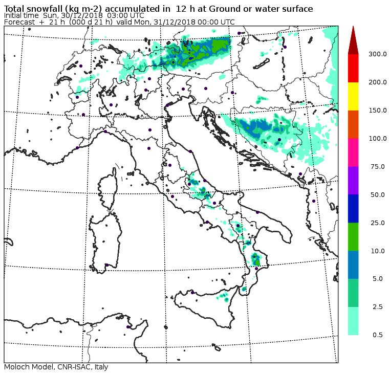 Scenario molto diverso al Centro/Sud dove nel pomeriggio/sera inizierà il brusco peggioramento accompagnato da aria fredda proveniente dai Balcani. Le temperature crolleranno sensibilmente portando la neve fino a bassa quota. Piogge e temporali interesseranno già in serata Abruzzo, Molise, Puglia, Basilicata, Calabria e Sicilia. Domani, Lunedì 31 Dicembre 2018, sarà una giornata tipicamente invernale con freddo pungente e forte maltempo proprio tra Abruzzo, Molise, Puglia, zone interne della Campania, Calabria e Sicilia. Altrove, al Nord, nelle Regioni centrali tirreniche e in Sardegna, continuerà a splendere il sole senza significative variazioni termiche: quest’ondata di freddo sarà limitata al medio/basso Adriatico e al Sud.