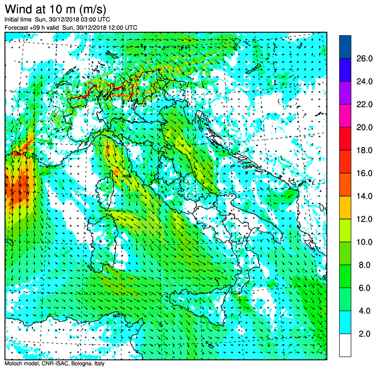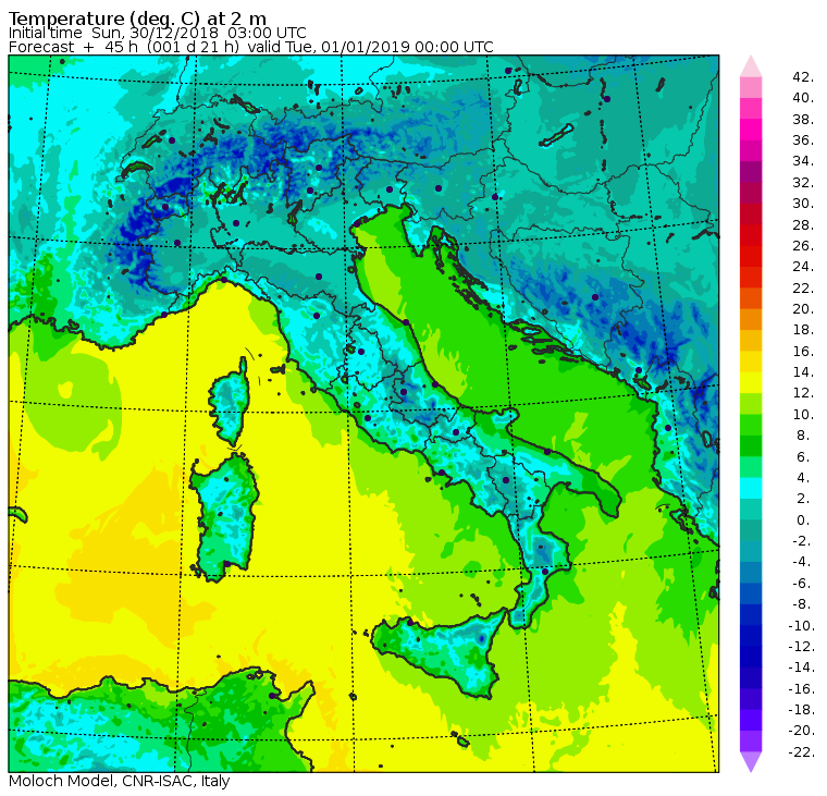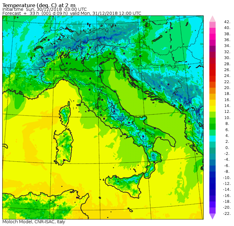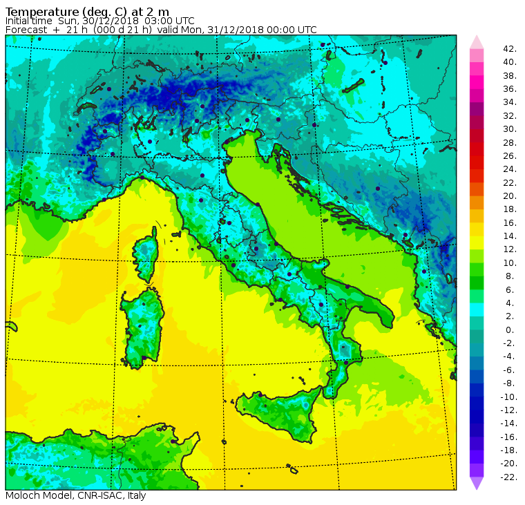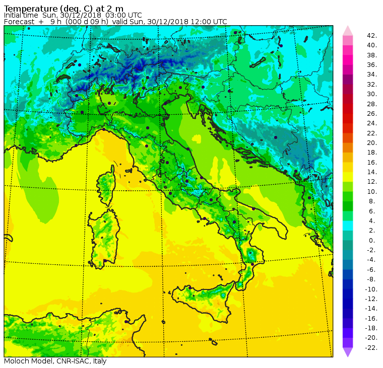 Allerta Meteo – Ultima Domenica del 2018 e penultimo giorno dell’anno con condizioni meteorologiche estreme sull’Italia: mentre Roma fa fatica a superare i +9°C e al Centro/Sud il cielo inizia a farsi via via sempre più scuro per l’imminente brusco peggioramento delle condizioni del tempo, accompagnato da una veloce sfuriata di freddo tra domani e il giorno di Capodanno, al Nord splende il sole e fa molto caldo per il forte vento di foehn che scende dalle Alpi e riscalda l’aria. Le temperature sono già elevatissime: in Piemonte spiccano i +21°C di Parella nel Canavese, più in generale abbiamo +20°C a Genova, Pallanza e Mergozzo, +19°C a Borgofranco d’Ivrea, Pray e Pietrastretta di Susa, +18°C a Domodossola, Sangiano e Omegna, +16°C a Milano, Bergamo, Cuneo, Como, Varese e Monza, +15°C a Sondrio e Aosta. Caldo anche in Emilia Romagna e al Nord/Est, dove spiccano i +10°C di Bologna, Parma e Udine. Nelle prossime ore le temperature aumenteranno ulteriormente con picchi di +22°C al Nord/Ovest.