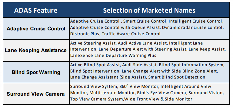 Il report, prendendo in considerazione 34 brand commercializzati negli USA, ha individuato 20 nomi per definire il cruise control adattivo, 29 nomi per i sistemi di mantenimento della corsia, 48 nomi per i sistemi anticollisione, 19 nomi per i sistemi di controllo dell’angolo cieco, 5 nomi per i sistemi di visione notturna e rilevamento pedoni ecc.