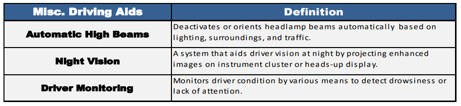 Pertanto la terminologia deve essere semplice, specifica e basata sulla funzionalità del sistema: Automated Driving Tasks, Collision Alerts, Collision Mitigation, Parking Assistance, e infine Miscellaneous Driving Aids sono questi i nomi scelti per le macro-categorie delle quali potete trovare le tabelle con i dettagli nella fotogallery.