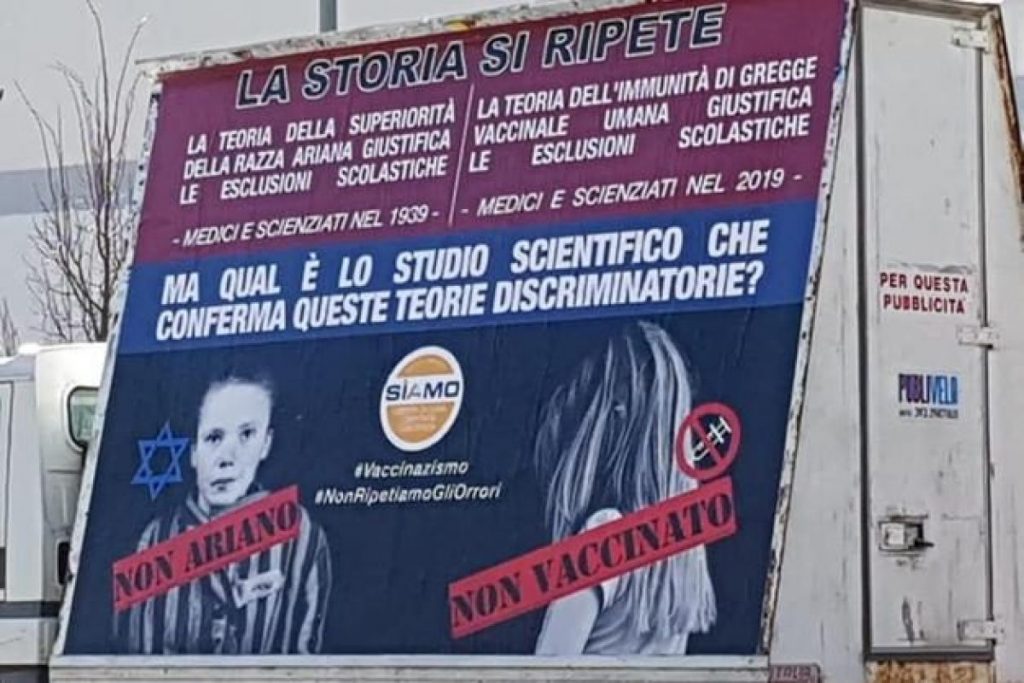 I no-vax sempre più estremi, sempre più improbabili e improponibili. A Trento, forse, hanno toccato il fondo della pateticità. Come tutti gli estremisti a priori, anche i gruppi contrari ai vaccini rasentano a volte il ridicolo, e anche se volessimo trovare delle ragioni nelle loro teorie, alcune propagande non fanno altro che allontanare sempre di più dalle loro idee una larga fascia di popolazione. Ma questa volta hanno raschiato quel fondo: hanno dato uno schiaffo morale alla storia e a migliaia di bambini morti nei campi di concentramento nazisti. A presentare il triste teatrino è una campagna itinerante ‘avvistata’ e documentata con fotografie in diversi luoghi della città. «La storia si ripete» recita il cartellone che riporta due foto: in una c’è una bambina non vaccinata girata di spalle, nell’altra una ‘finta’ bambina ebrea in un campo di sterminio. «La teoria della superiorità della razza ariana giustifica le esclusioni scolastiche» si legge, e ancora «la teoria dell’immunità di gregge vaccinale umana giustifica le esclusioni scolastiche».