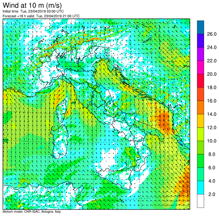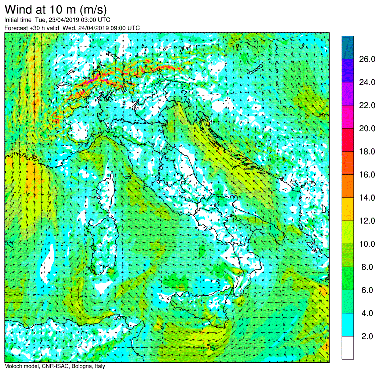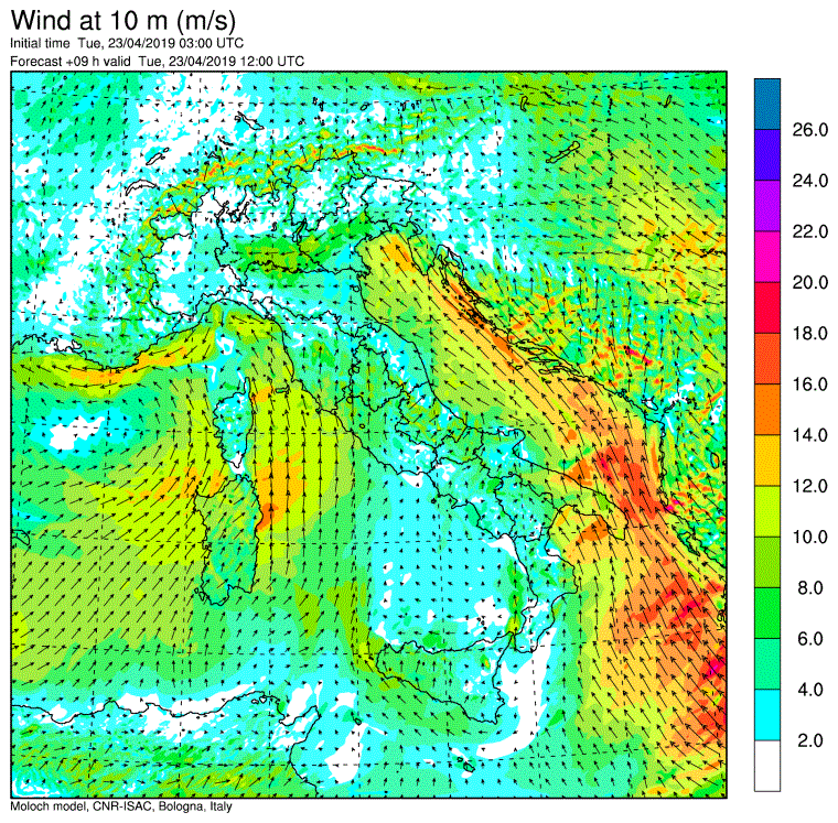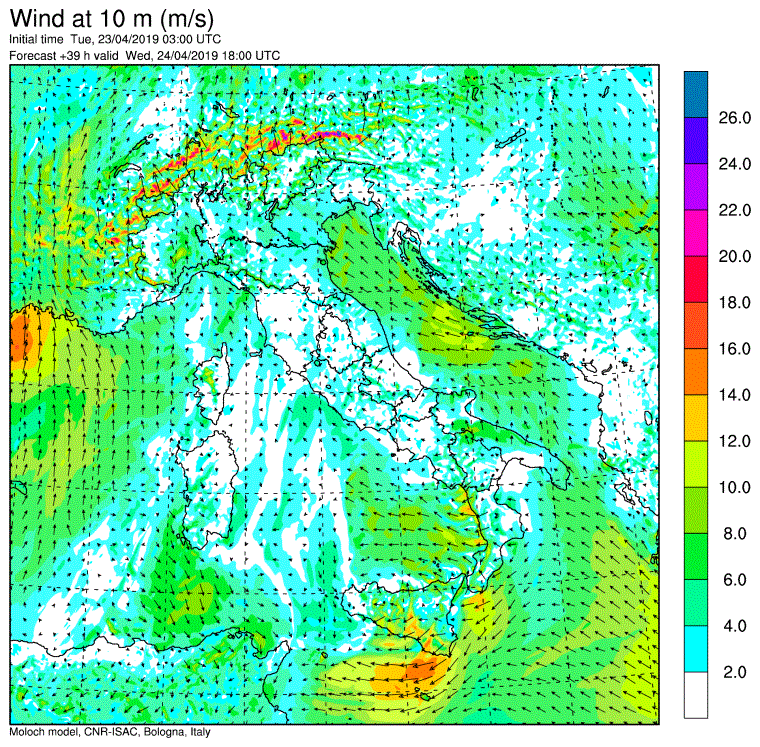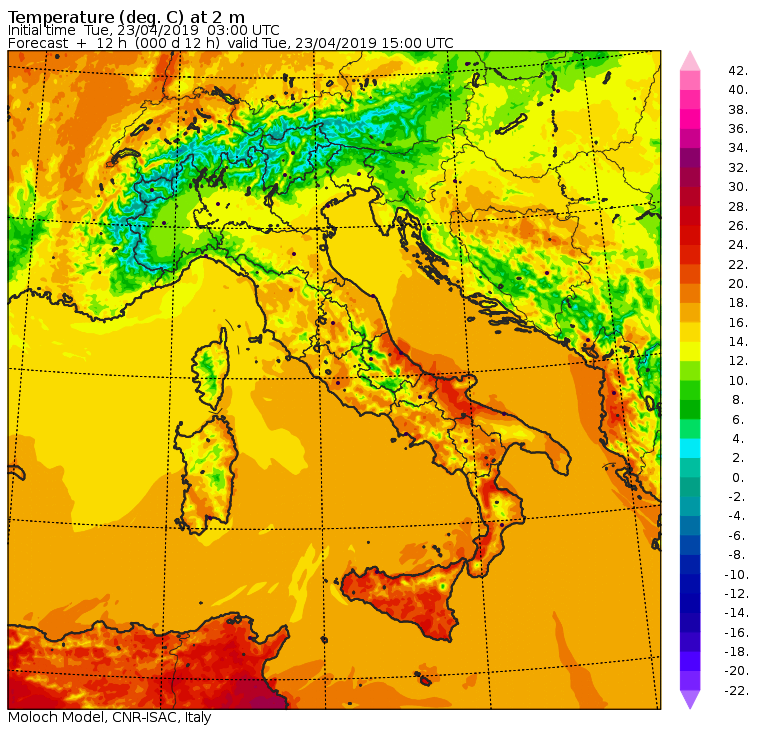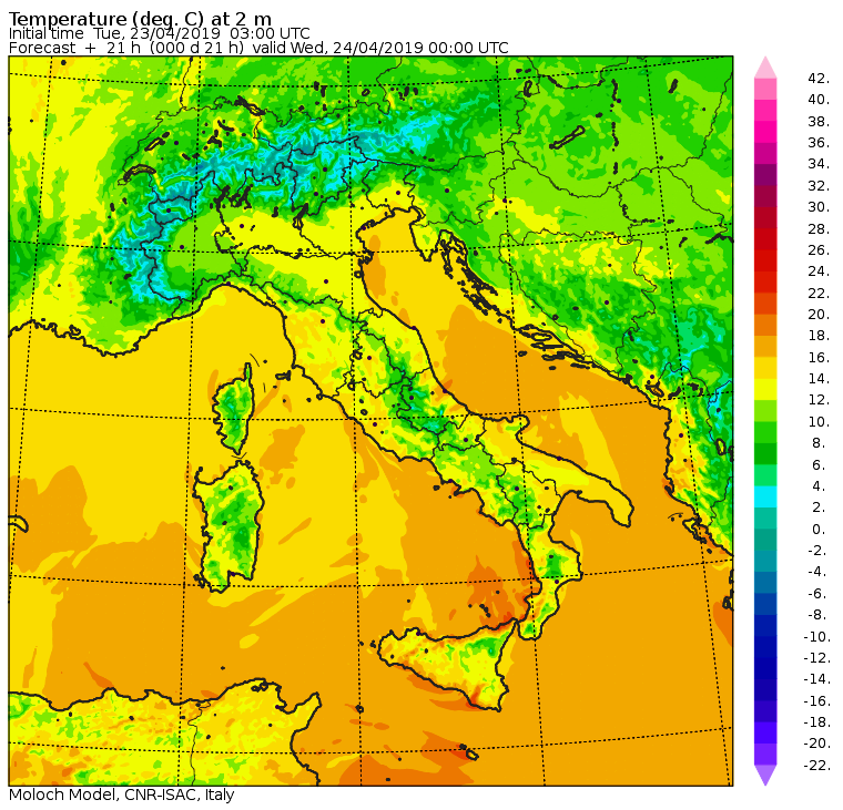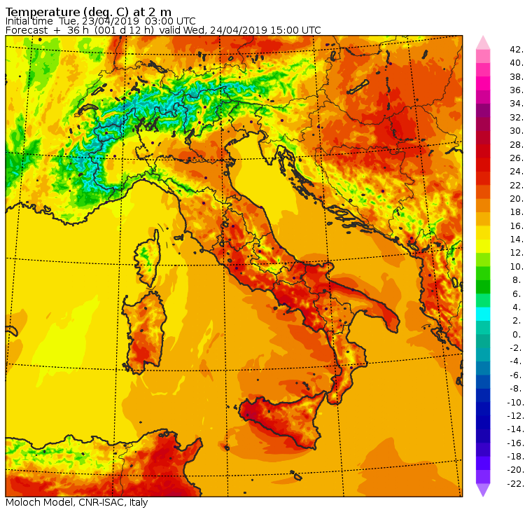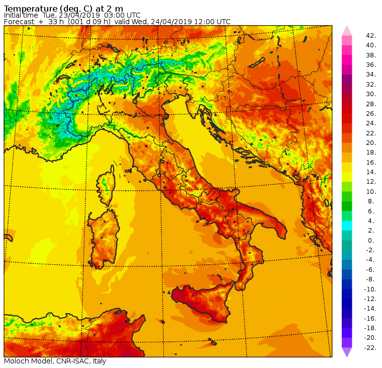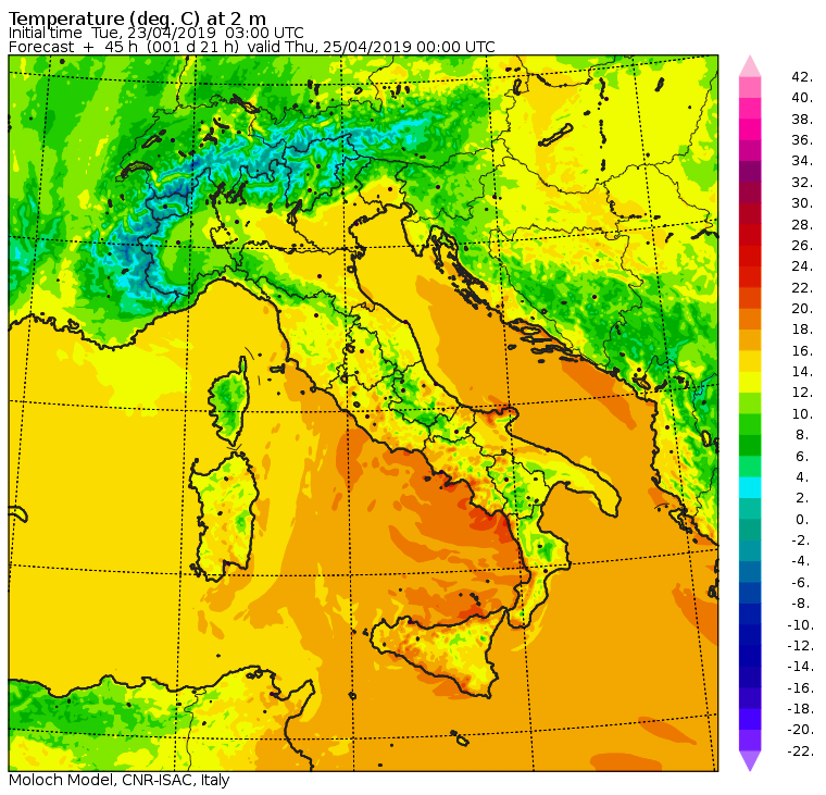 Al Centro/Sud, invece, si sono attenuati i venti di scirocco che ieri, nel giorno di Pasquetta, hanno soffiato in modo impetuoso con raffiche fino a 135km/h in Sicilia provocando danni e disagi: le temperature stanno sensibilmente aumentando ovunque, abbiamo +25°C a Palermo, Bagheria, Termini Imerese, Barcellona Pozzo di Gotto e Rosarno, +23°C a Trapani e Cetraro, +22°C a Vibo Valentia e Paola, +21°C a Cosenza, Termoli, Barletta, Amantea e Soverato, +20°C a Catania, Messina, Reggio Calabria e Salerno.