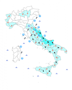 Venti: forti dai quadranti settentrionali con raffiche di burrasca su Toscana, Sardegna, Liguria, settori adriatici settentrionali e marchigiani, e localmente su alto Lazio, litorali abruzzesi e settori alpini centro-orientali, con raffiche di Foehn, nelle adiacenti valli alpine; di burrasca o burrasca forte nord-orientali sui crinali dell’Appennino tosco-emiliano, tosco-romagnolo e umbro-marchigiano, con forti raffiche di caduta nelle valli e pianure della Toscana interna e dell’Umbria.