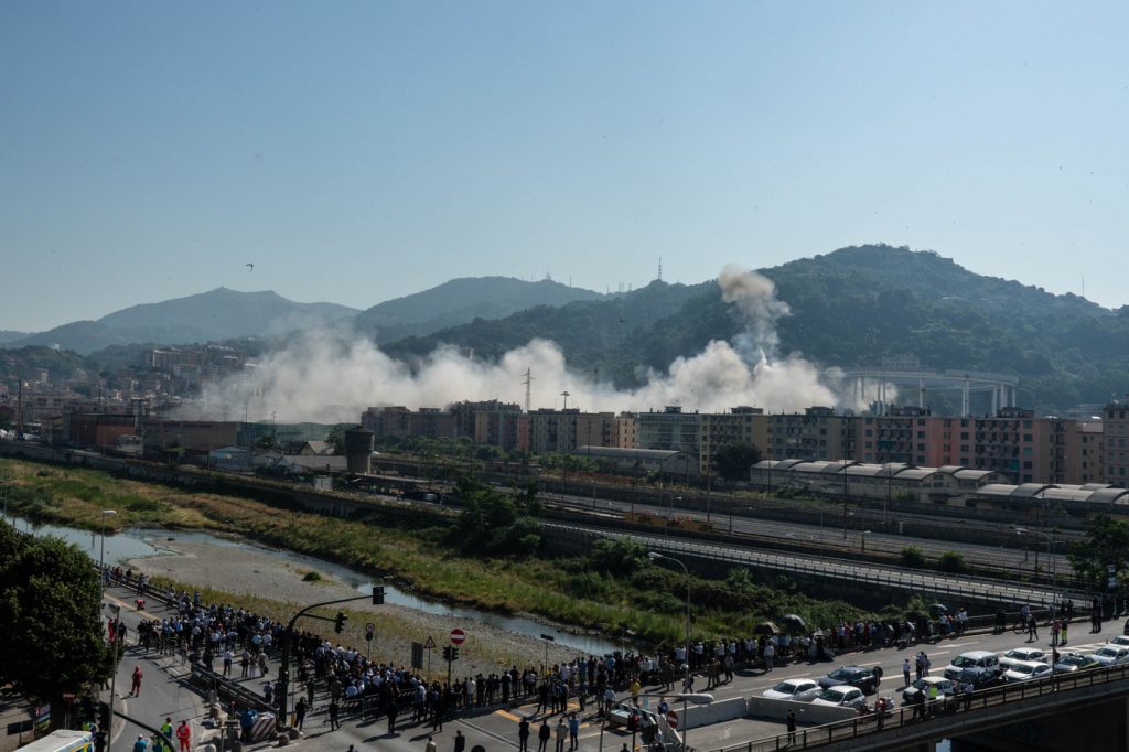 Necessari solo 6 secondi per fare cadere le pile 10 e 11 del viadotto con l’esplosione di oltre una tonnellata di dinamite. L’operazione ha comportato una serie di chiusure di autostrada (casello di Genova Ovest), strade e limitazioni alla ferrovia. Sono state prese misure straordinarie della protezione civile e sono stati lanciati appelli, da enti come Enac e compagnie di navigazione, per avvertire i viaggiatori diretti al porto e all’aeroporto di muoversi con largo anticipo.