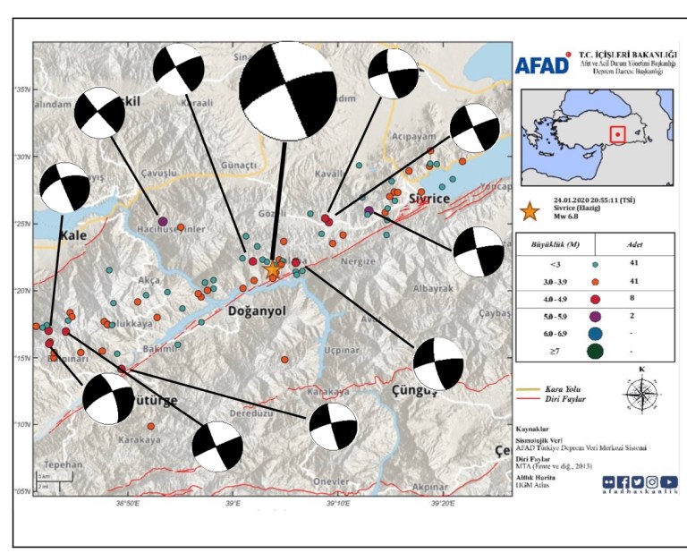 Il terremoto è avvenuto su una faglia trascorrente nella zona orientale del Paese, come si vede dal meccanismo focale dell’evento (Fig. 2) e dall’allineamento delle scosse successive (aftershocks, Fig. 1). Si tratta di una faglia molto conosciuta, la Faglia Est Anatolica (EAF, v. sotto), dove recentemente si sono verificati terremoti di magnitudo simile: quello di magnitudo M 6.1 nel 2010 a Elazig, il terremoto di magnitudo M 6.4 e quello di magnitudo M 6.8 a Bingol nel 2003 e nel 1971. Il catalogo strumentale dall’anno 1900 ad oggi presenta più di 300 terremoti con magnitudo maggiore di 4.0 e il più forte ha avuto magnitudo pari a 6.8.