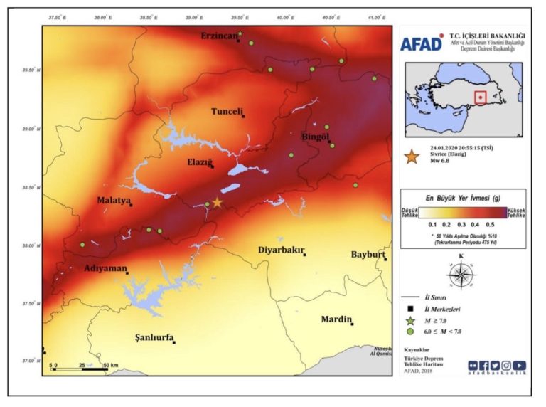 Il 24 gennaio 2020 alle 18:55 ore italiane (20:55 locali) la Turchia è stata colpita da un terremoto con una magnitudo pari a 6.8 (stima dell’AFAD, Agenzia turca per la gestione dell’emergenza e dei disastri; 6.7 è la stima dell’USGS, 6.6 secondo l’INGV). Il terremoto ha colpito la Turchia orientale, nella provincia di Elazi? (città di circa 600.000 abitanti), e ha provocato danni rilevanti nei villaggi di Sivrice e Çevrimta?, più prossimi all’epicentro, provocando circa 30 vittime e più di 1200 feriti (stime provvisorie). Secondo alcune stime pervenute dalla regione, ci sarebbero circa 100 edifici crollati (totalmente o parzialmente).