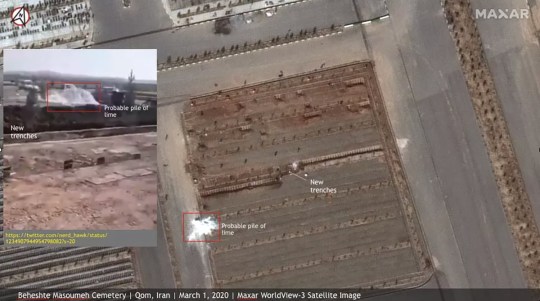Altre foto, pubblicate da Maxar Technologies, mostrano gran parte del cimitero ancora inutilizzato ad ottobre dello scorso anno. Ma all’inizio di marzo, il quadrante in alto a destra nelle immagini, precedentemente utilizzato a metà, sembrava essere completamente pieno, mentre i lavori iniziavano in un’altra sezione non utilizzata. Un analista ha indicato che nelle immagini si possono vedere anche cumuli di calce, riporta il Washington Post. Le autorità iraniane avevano precedentemente confermato di utilizzare la calce nella sepoltura delle vittime del coronavirus. La calce può essere utilizzata per gestire la decomposizione e l’odore causato dalle fosse comuni. L’esperto suggerisce anche che gli appezzamenti sono stati scavati in maniera differente rispetto agli altri sul sito, il che potrebbe indicare che sono stati creati in fretta e furia per tenere il passo del crescente bilancio delle vittime nel Paese.