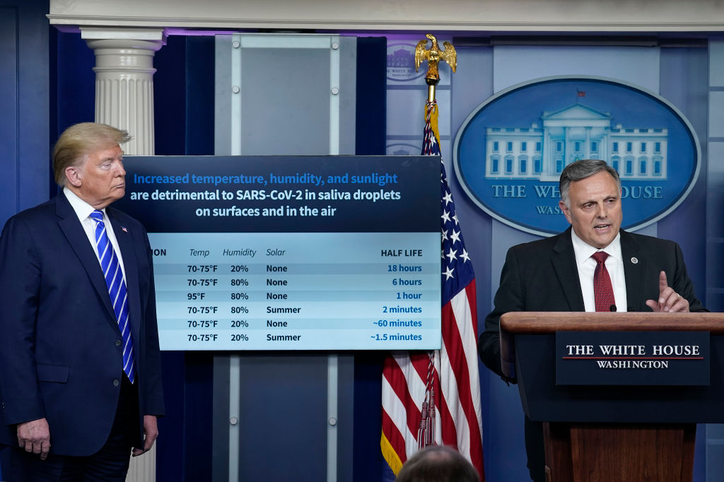 Durante il briefing della task force della Casa Bianca, tenutosi ieri, un funzionario ha presentato i risultati della ricerca del governo statunitense che indica che il coronavirus sembra indebolirsi molto velocemente quando esposto alla luce solare e al calore. Lo studio ha anche dimostrato che la candeggina potrebbe uccidere il virus nella saliva o nei fluidi respiratori in 5 minuti e che l’alcol isopropilico potrebbe ucciderlo persino più velocemente. L’advisor William Bryan ha sottolineato i risultati nella conferenza stampa.