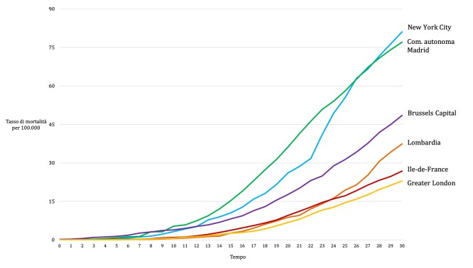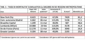 I tassi cumulativi di mortalità più alti a 30 giorni dall’inizio dell’epidemia sono stati registrati nelle aree di New York (81,2 x 100.000) e Madrid (77,1 x 100.000) mentre la Lombardia con (41,4 per 100.000) è sotto la media ed è l’unico caso in cui la metropoli capoluogo (Milano) non sia stata investita massicciamente dall’onda epidemica. Lo studio analizza le ragioni di questi dati attraverso un confronto delle misure di contenimento adottate e del ruolo svolto dalla rete ospedaliera.