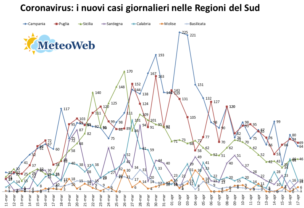 Il grafico con i casi giornalieri nelle Regioni del Sud: