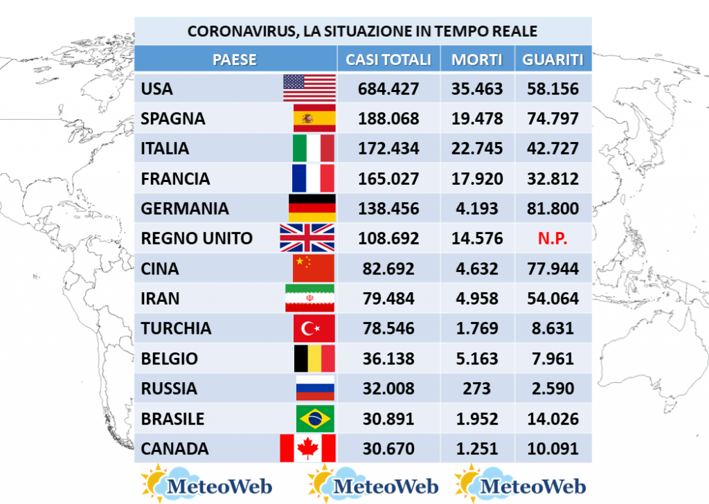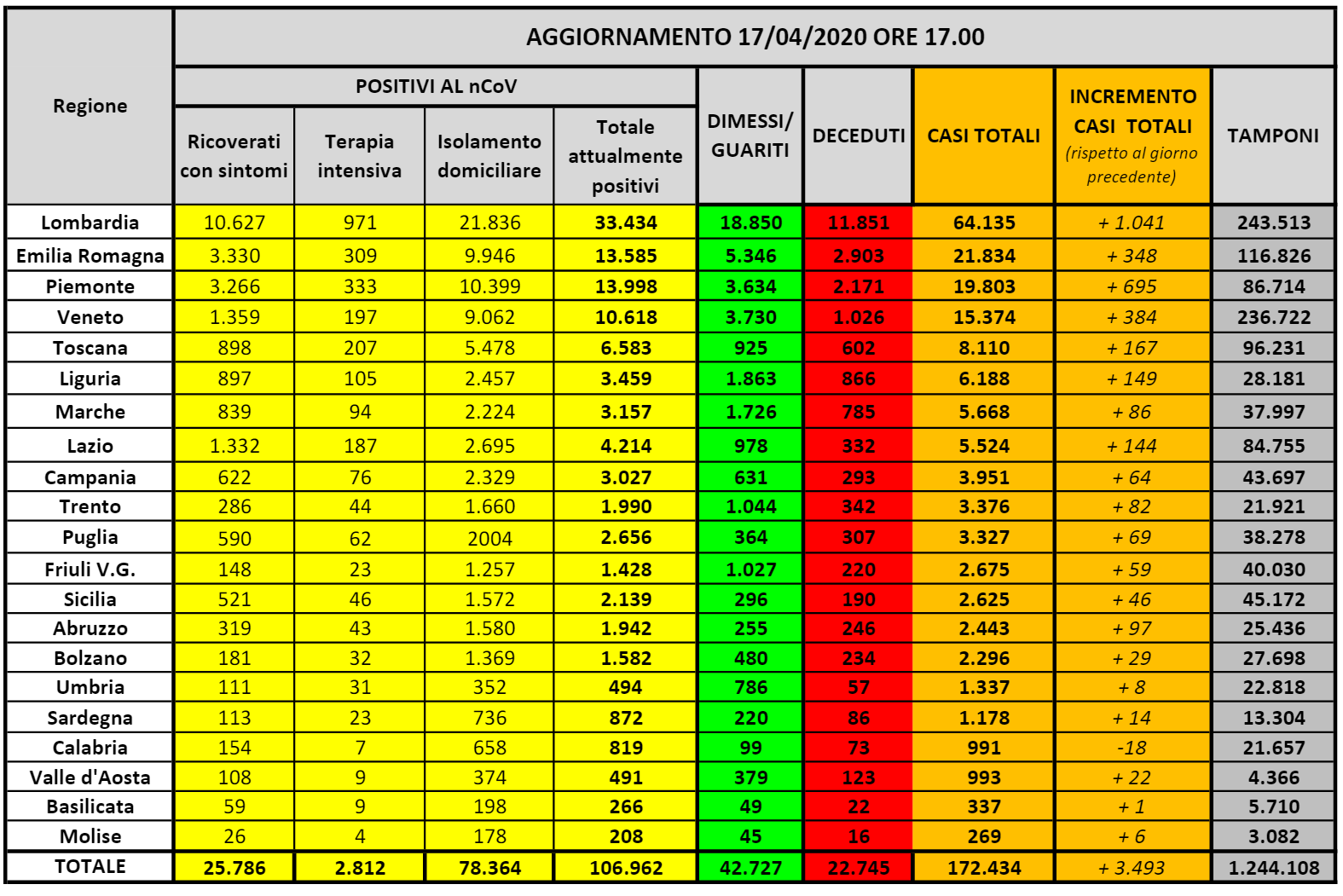 I dati sull’epidemia di Coronavirus in Italia sono oggi molto confortanti: ci sono stati altri 575 morti, 2.563 guariti e 3.493 nuovi casi su ben 65.705 tamponi effettuati, record assoluto dall’inizio della pandemia. E’ risultato positivo appena il 5,3% dei controllati, la percentuale più bassa dall’inizio di quest’incubo. Oggi, inoltre, c’è stato un numero altissimo di guariti e si sono liberati oltre 1.200 posti letto degli ospedali. La situazione, quindi, è estremamente confortante. Il bilancio complessivo dell’Italia è adesso di: