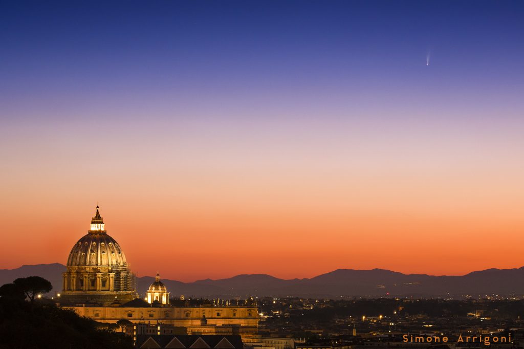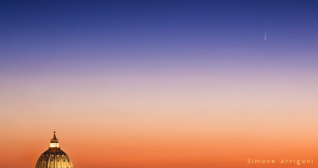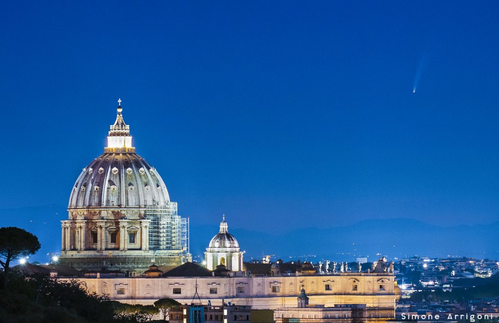 È il caso degli splendidi scatti realizzati da Simone Arrigoni, che ha catturato la cometa NEOWISE “direttamente da dentro Roma con San Pietro in primo piano”. Nelle immagini che trovate nella gallery scorrevole in alto, a corredo dell’articolo, il bagliore della cometa si staglia nel cielo sopra la Capitale, dove svetta la meravigliosa cupola di San Pietro. Arrigoni ha ritrovato in questi scatti una simbologia molto particolare: «Abbiamo visto sorgere la sua stella e siamo venuti per adorarlo» (Matteo 2, 2).