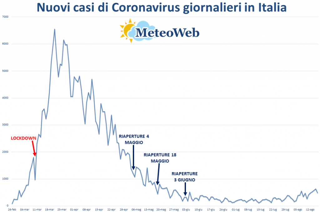 Ecco il grafico con l’andamento del dato dei nuovi contagi giornalieri in Italia dal 26 Febbraio: