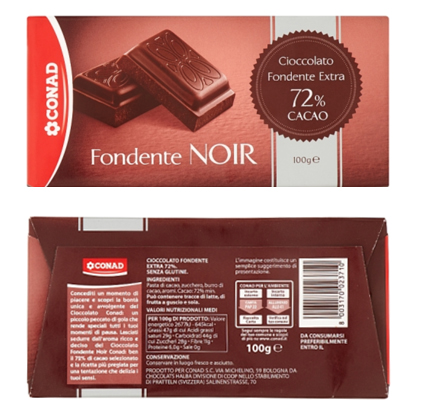 La catena di supermercati Conad ha pubblicato in data odierna, sul proprio sito web, un importante avviso per i clienti in merito al richiamo del prodotto “Cioccolato Fondente Noir“. Si tratta di Cioccolato Fondente Extra, 72% Cacao (100 g) a marchio Conad, Codice EAN 8003170023710 e TMC 30.10.21, Prodotto nello stabilimento di Chocolats Halba Divisione di Coop – Salinenstrasse 70 – CH4133 Pratteln – Svizzera. I lotti interessati al richiamo sono i seguenti: