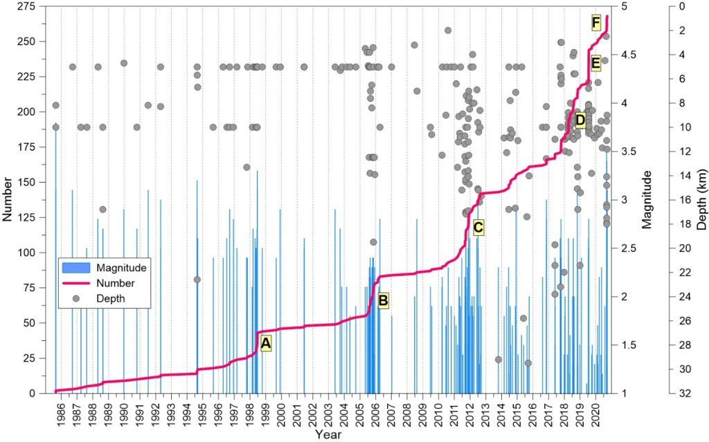 Dal 2017 in poi le sequenze sismiche sembrano allinearsi su un asse circa NW-SE.
