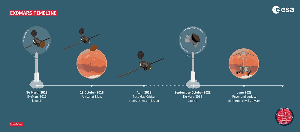 Il programma ExoMars è uno sforzo congiunto tra ESA e Roscosmos. Oltre alla missione del 2022, comprende il Trace Gas Orbiter (TGO) lanciato nel 2016. TGO sta già fornendo importanti risultati scientifici oltre a trasmettere dati dal rover marziano Curiosity della NASA e dal modulo di atterraggio, o lander, InSight. Trasmetterà inoltre i dati della missione ExoMars 2022 quando arriverà su Marte nel 2023.