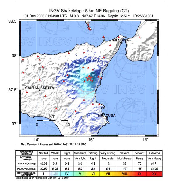 Una nuova scossa di terremoto, stavolta ancora più forte, ha colpito il versante meridionale dell’Etna alle 22:54 della Notte di San Silvestro. L’INGV stima la scossa in magnitudo 3.8 a 12.5km di profondità, sempre con epicentro a Ragalna. Lo sciame sismico iniziato alle 21:00 continua ad intensificarsi, con scosse di magnitudo crescente, mentre continua l’attività eruttiva del vulcano.
