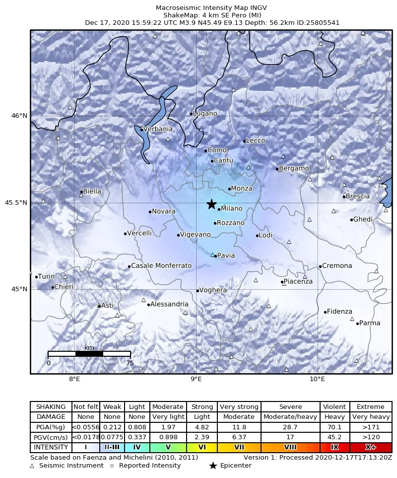 Oggi pomeriggio nel milanese la paura è stata tanta. Un terremoto anche di magnitudo modesta, che si verifica in una zona così densamente popolata come la Lombardia, può far tremare milioni di persone. E così è stato. Si è trattato del più forte terremoto con epicentro nel milanese degli ultimi 500 anni, quello registrato oggi alle 16:59 con magnitudo (ulteriormente rivista) pari a 3.9. Lo rileva Lucia Luzi, a capo della sezione di Milano dell’Istituto Nazionale di Geofisica e Vulcanologia (Ingv). L’epicentro è avvenuto in provincia di Milano, 4 km da Pero (MI), 6 km a ovest di Milano, a una profondità di 56 km. L’area interessata dall’evento sismico di questo pomeriggio è considerata a pericolosità sismica moderata.