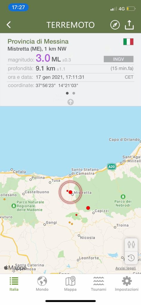 Alle 17:11 di oggi in provincia di Messina si è verificata una scossa di terremoto di magnitudo 3. L’epicentro del sisma è stato registrato a Mistretta, con un ipocentro ad una profondità di 9,1 km. Il terremoto, nonostante la modesta entità, è stato avvertito dalla popolazione per via dell’ipocentro piuttosto superficiale.