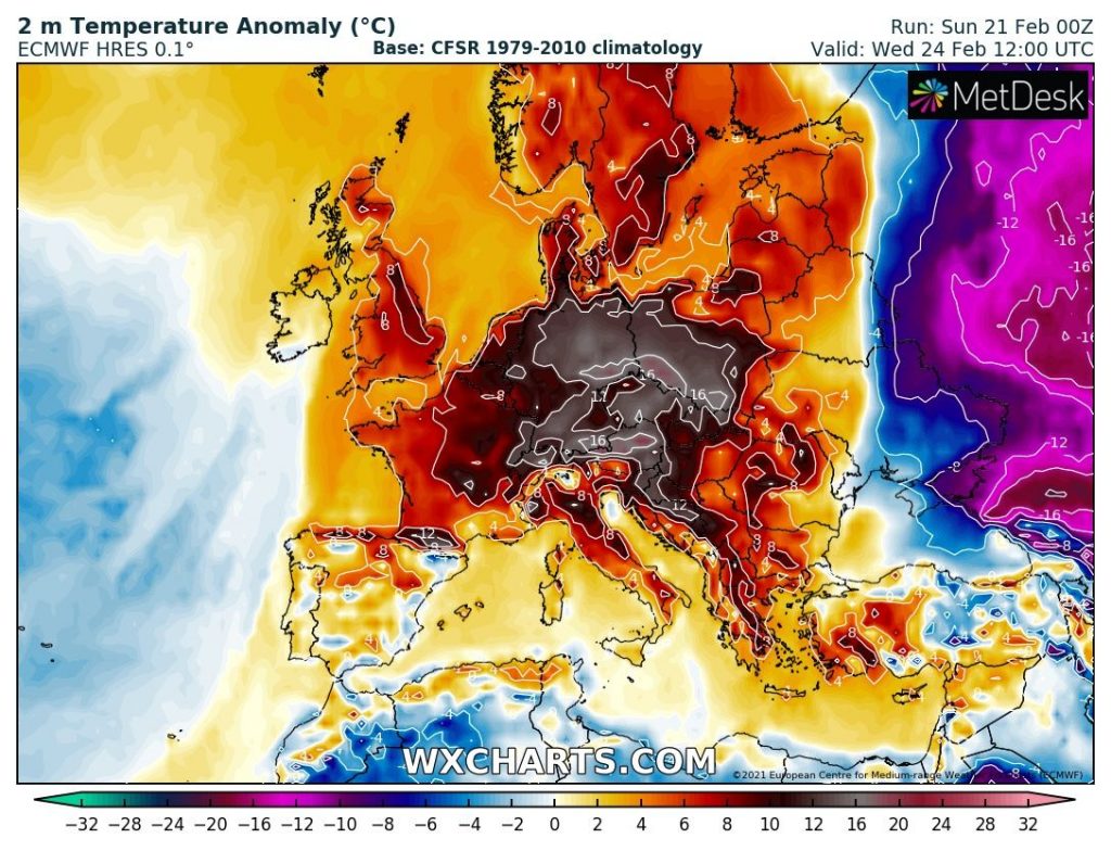 Questo periodo di caldo avverrà per lo sviluppo di una dorsale molto ampia e potente in questi giorni. Nella giornata di mercoledì 24 febbraio, la dorsale coprirà gran parte del continente, mentre sul Nord Atlantico sarà presenta una profonda depressione. Le temperature raggiungeranno picchi di +20°C in molte aree, localmente anche oltre. Le temperature generali saranno ben al di sopra della media di fine febbraio, fino a 10-13°C più alte della norma, dando i primi accenni di primavera in molte aree del continente durante la prossima settimana. Il cold pool sulla Russia nordoccidentale inizierà finalmente a indebolirsi e a spostarsi verso est-sudest, così le temperature aumenteranno anche lì verso metà settimana. Grazie alla profonda depressione sul Nord Atlantico, l’avvezione della massa d’aria da sud porterà condizioni più calde anche in Scandinavia, con le temperature che saranno di quasi 12°C sopra la media.