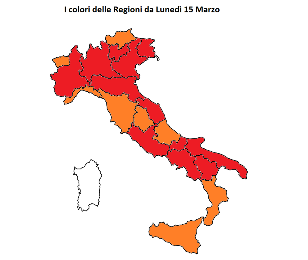 L’esito della riunione della Cabina di regia ministero della Salute-Iss-Regioni che ha analizzato questa mattina i dati settimanali, fermo restando che per l’ufficialità come sempre occorre attendere le relative ordinanze del ministro Speranza, pone a partire da Lunedì 15 Marzo 12 Regioni in zona rossa, 7 in arancione e una in zona bianca.