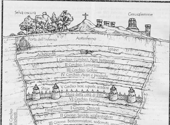 L’Inferno può essere visto come una metafora dell’interno della Terra, divisa in diversi settori di grandi dimensioni: Incontinenza, Violenza, Ripa discoscesa(2), Frode e così via. L’Inferno è diviso in nove cerchi, che diventano dieci con l’Antinferno. Il Purgatorio è organizzato in nove livelli (a Dante piacciono il numero tre, simbolo della Santissima Trinità, e nove, tre volte tre). Ciascuna delle nove zone è riservata, nell’Inferno, ad un particolare peccato, il meno grave dei quali occupa la parte superiore. Le mura della città di Dite e il fiume Stige separano il quinto dal sesto cerchio (gli Iracondi dagli Eretici).