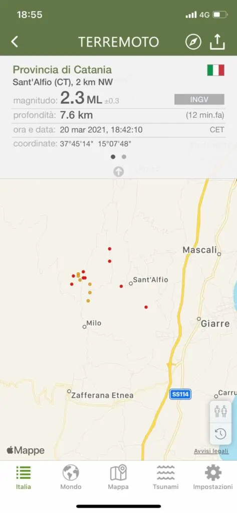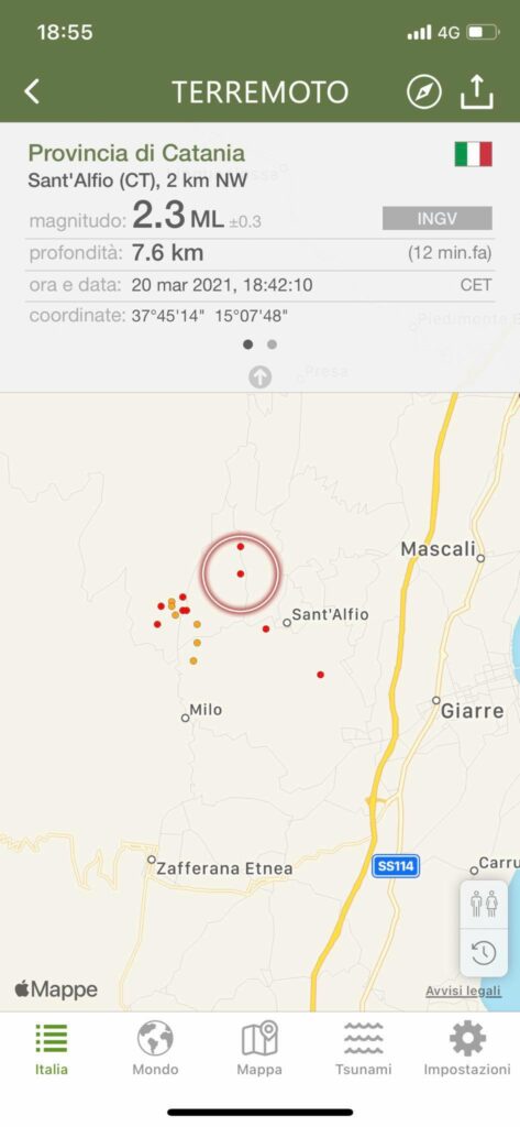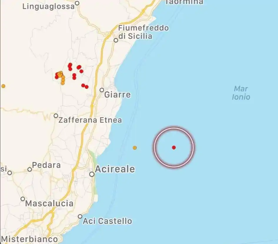 Alle 19:19 una scossa di terremoto si è verificata anche in mare, al largo della costa catanese, con una magnitudo di 2.4, ad una profondità di 33,5 km.