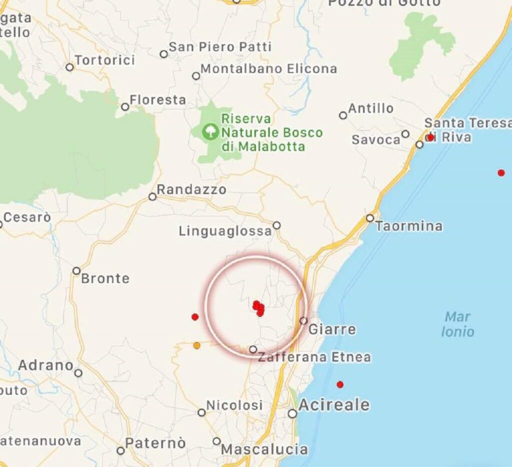 Alle 10:18 di stamattina, un altro terremoto si era verificato nel Mar Ionio, lungo la costa catanese. La scossa ha avuto magnitudo 2.6 e profondità di 3km.