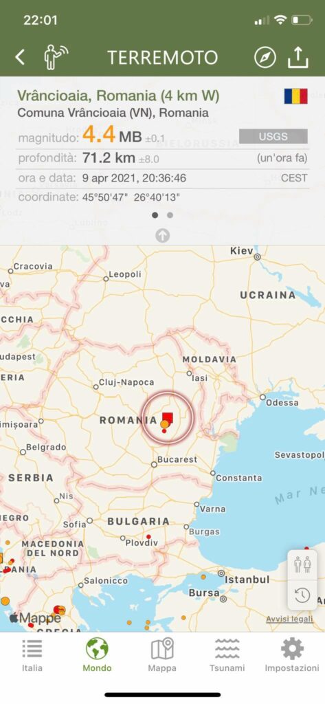 Una scossa di terremoto di magnitudo 4.4 si è registrata alle 20:36 di questa sera nella Romania centrale, in particolare con epicentro a Vrancioaia. Come riferiscono i media regionali, l’epicentro del sisma è stato localizzato a circa 80 km a ovest di Brasov, a una profondità di 71.2 km. Non sono giunte finora notizie di eventuali danni, ma c’è apprensione nel paese dato che la scossa si è verificata nella stessa zona del devastante terremoto del 1977.