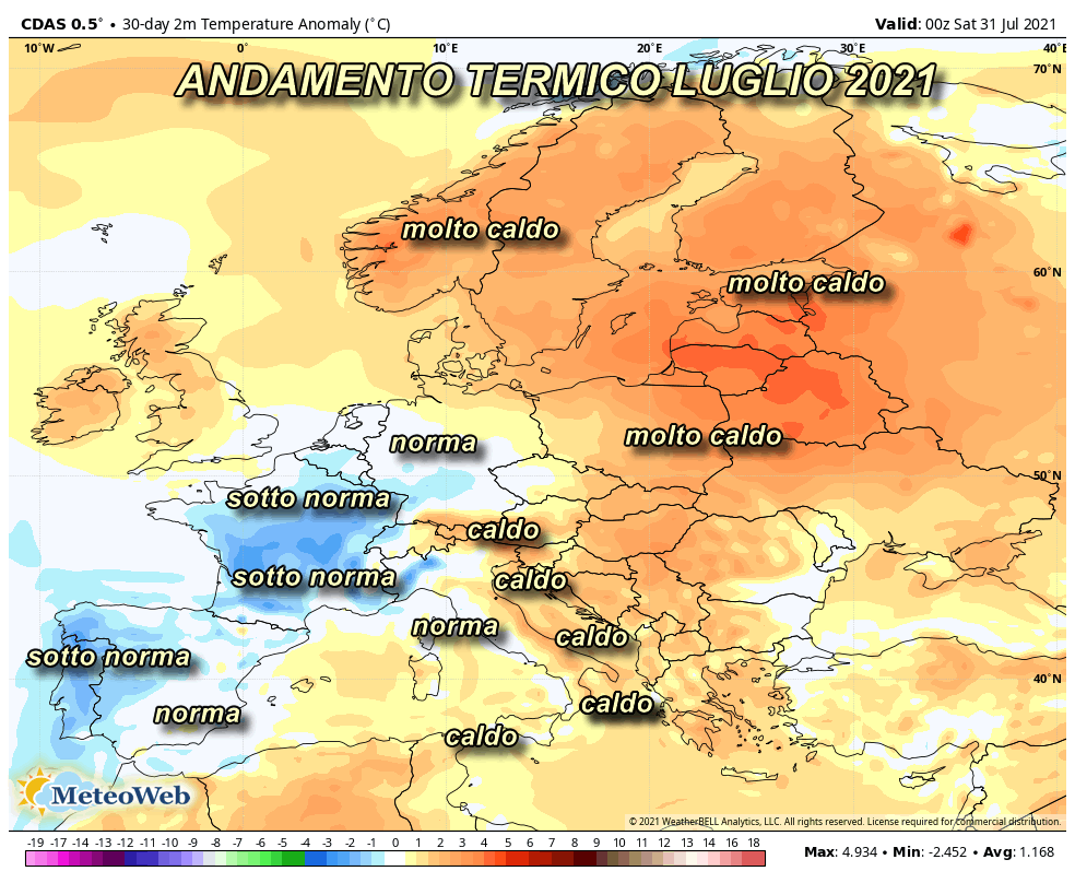 Luglio oramai è all’epilogo ed è tempo di bilanci sul mese estivo per eccellenza. Rileviamo subito che il decorso meteo è apparso agli antipodi a seconda delle varie zone del paese, comportando, per alcune fasi, estremi sia in termini di siccità e caldo che di mitezza e maltempo. Il bilancio complessivo, tuttavia, vede anomalie si presenti, ma non particolarmente accentuate e soprattutto non particolarmente estese. In riferimento all’azione calda, come mostra l’immagine di sintesi sull’anomalia termica a scala europea, emerge un quadro generale della temperatura sull’intero mese, nella norma o più spesso sotto la norma sulle regioni centro-occidentali del continente.